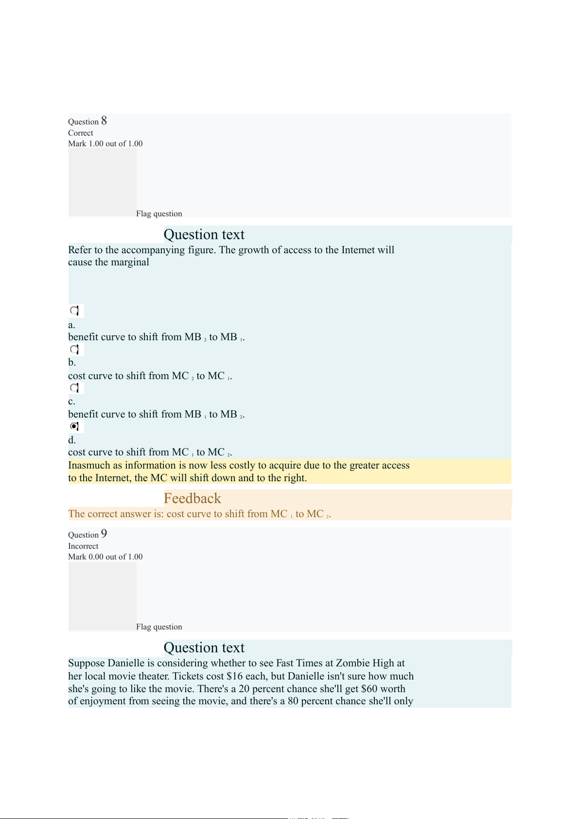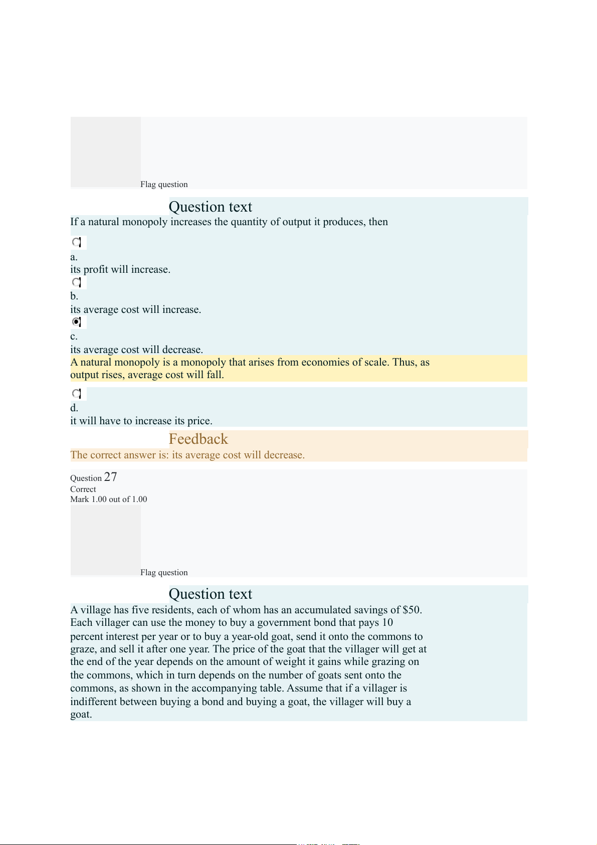 The correct answer is: marginal cost is $0. Question 22 Correct Mark 1.00 out of 1.00 Flag question Question text