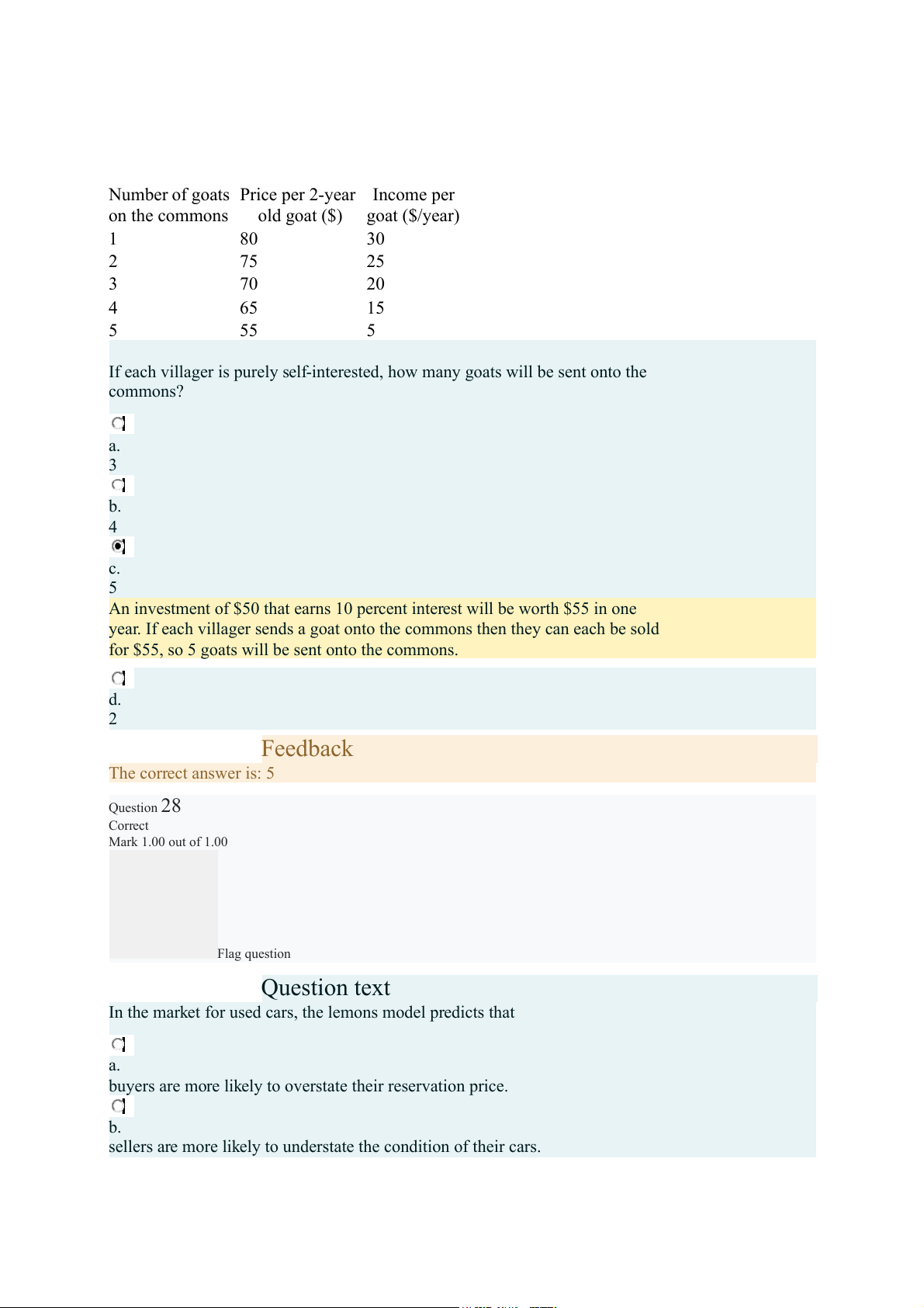 for $55, so 5 goats will be sent onto the commons. d. 2 Feedback The correct answer is: 5 Question 28 Correct Mark 1.00 out of 1.00 Flag question Question text