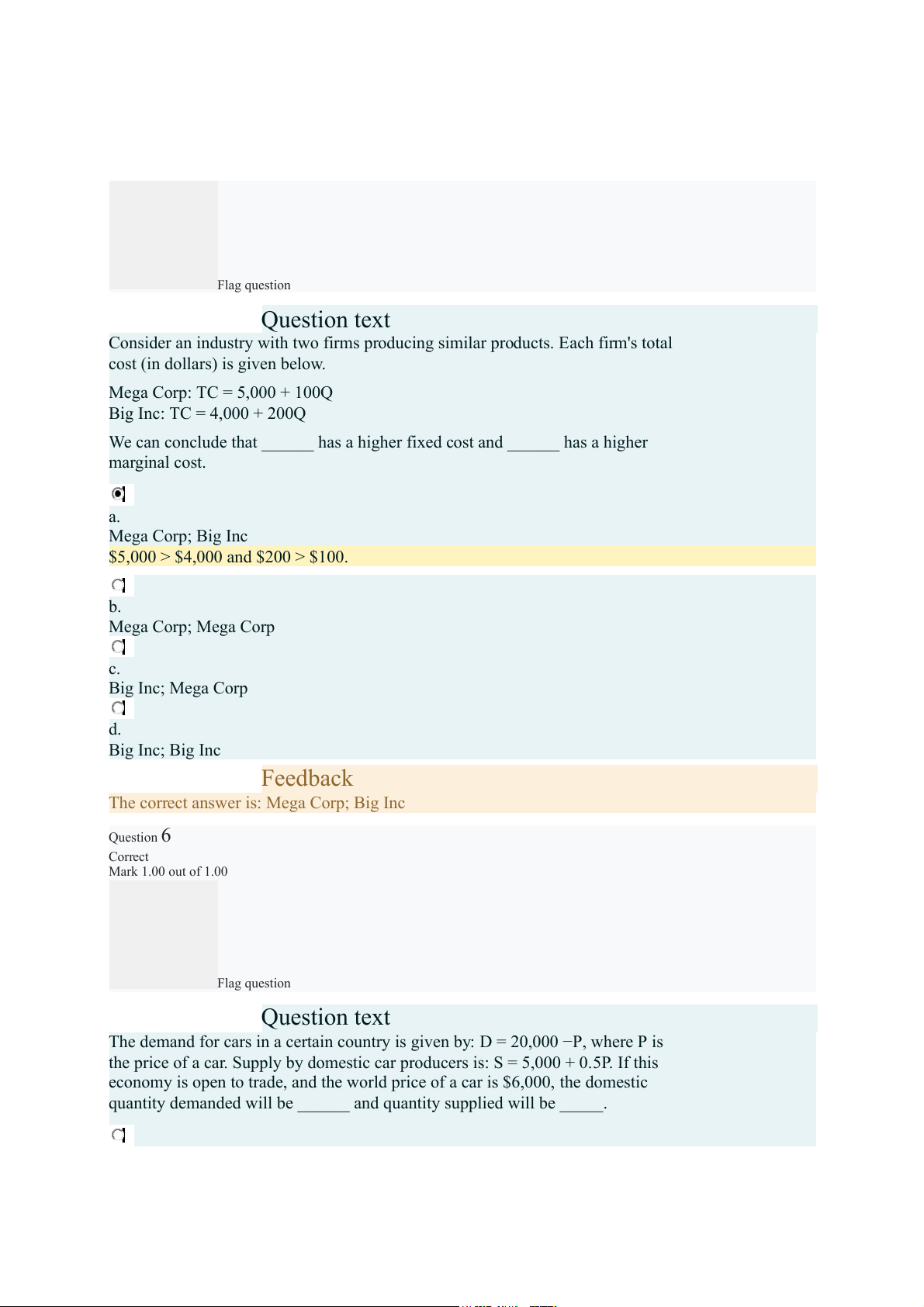 The correct answer is: start-up costs; variable costs Question 23 Correct Mark 1.00 out of 1.00 Flag question Question text