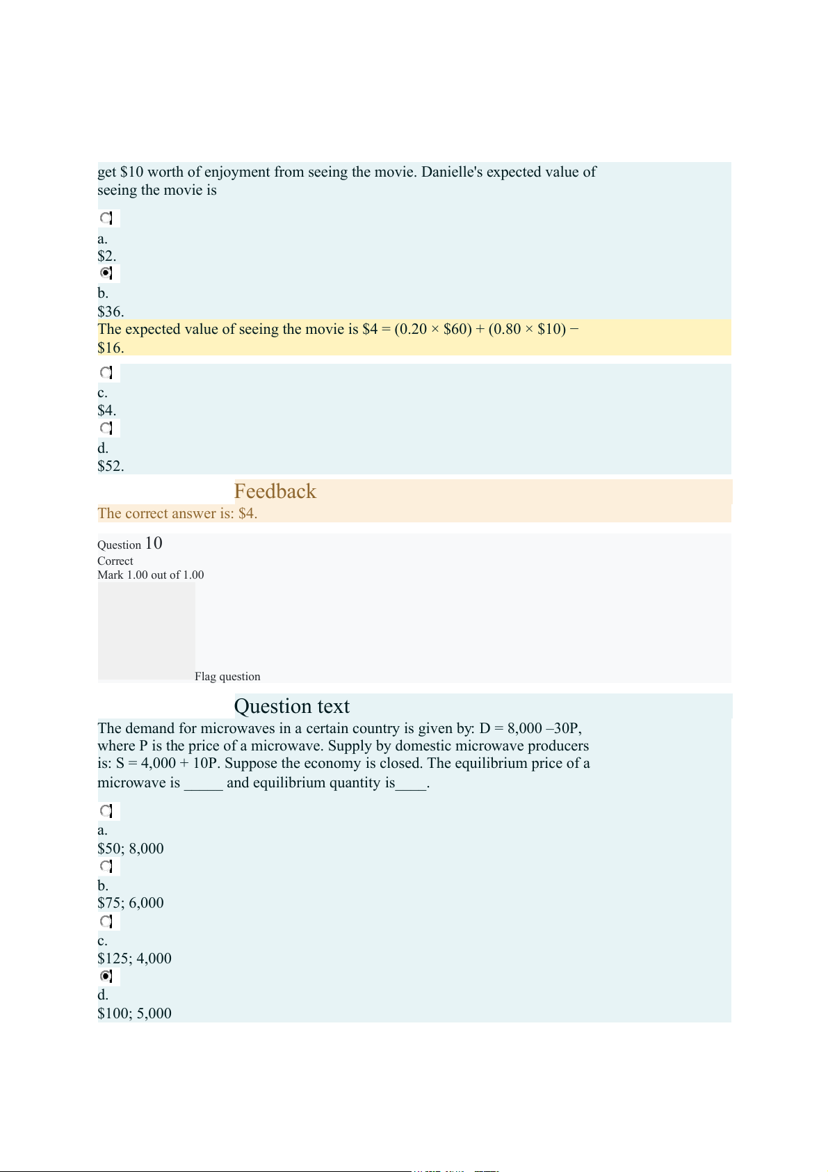 The expected value of seeing the movie is $4 = (0.20 × $60) + (0.80 × $10) − $16. c. $4. d. $52. Feedback The correct answer is: $4. Question 10 Correct Mark 1.00 out of 1.00 Flag question Question text