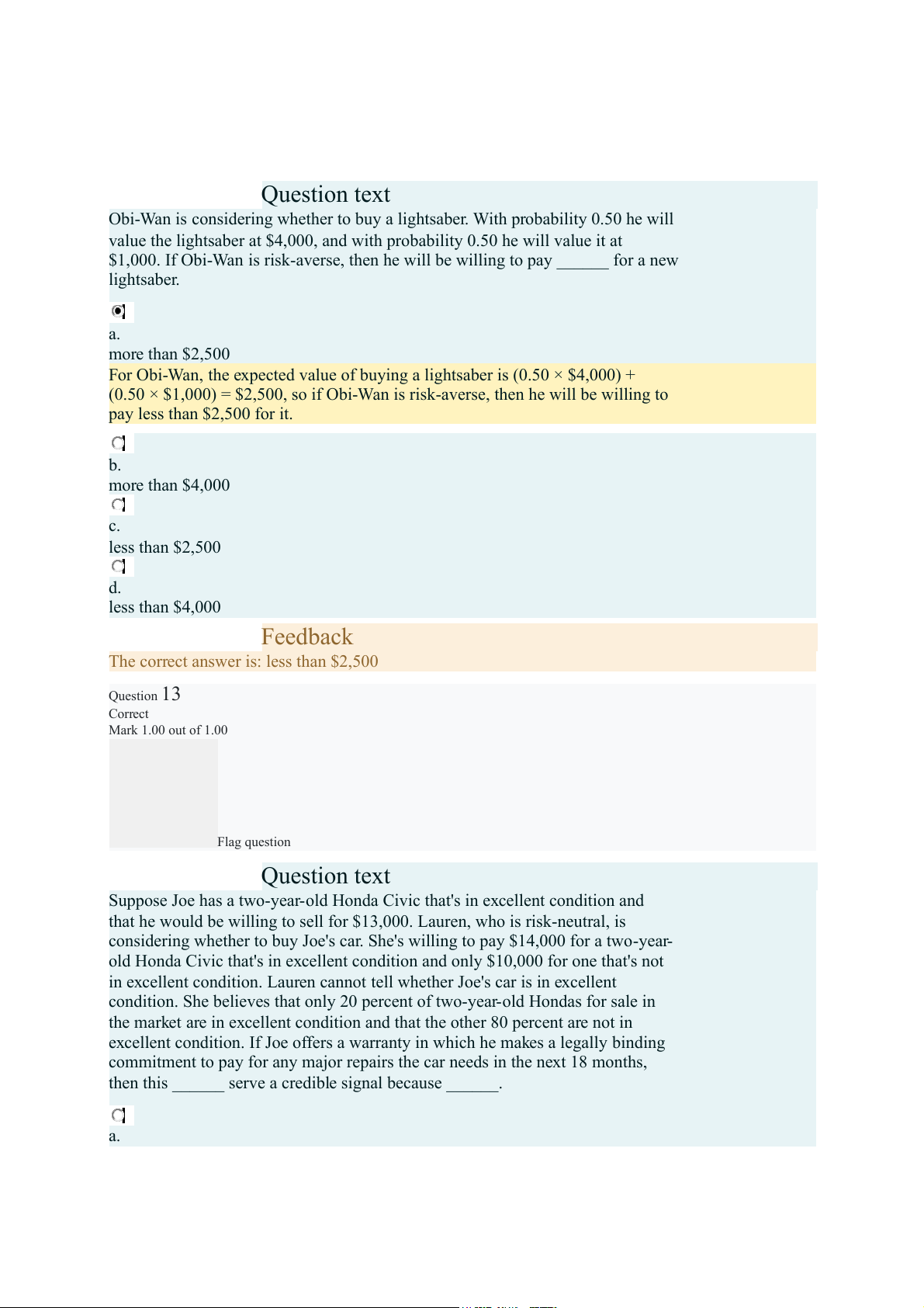 (0.50 × $1,000) = $2,500, so if Obi-Wan is risk-averse, then he will be willing to pay less than $2,500 for it. b. more than $4,000 c. less than $2,500 d. less than $4,000 Feedback