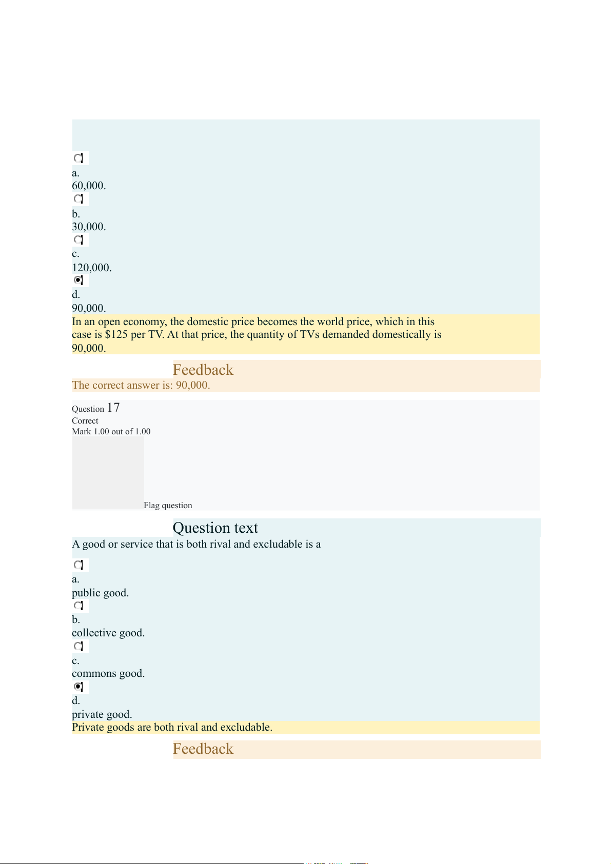 case is $125 per TV. At that price, the quantity of TVs demanded domestically is 90,000. Feedback The correct answer is: 90,000. Question 17 Correct Mark 1.00 out of 1.00 Flag question Question text