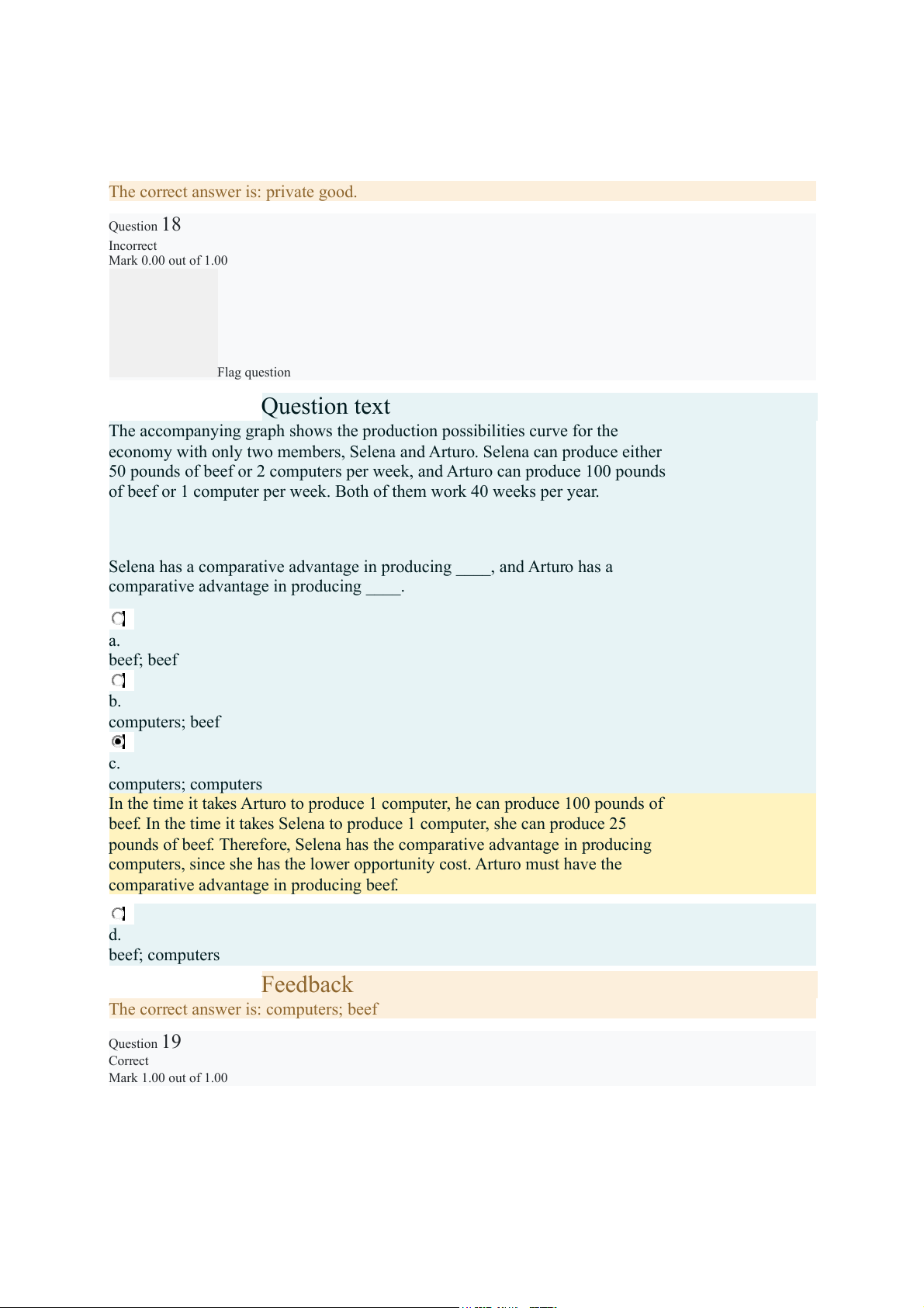 The correct answer is: computers; beef Question 19 Correct Mark 1.00 out of 1.00 Flag question Question text