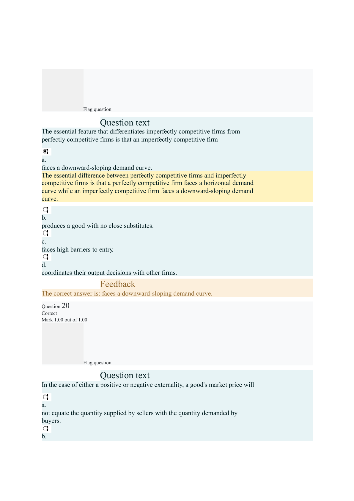 The correct answer is: faces a downward-sloping demand curve. Question 20 Correct Mark 1.00 out of 1.00 Flag question Question text