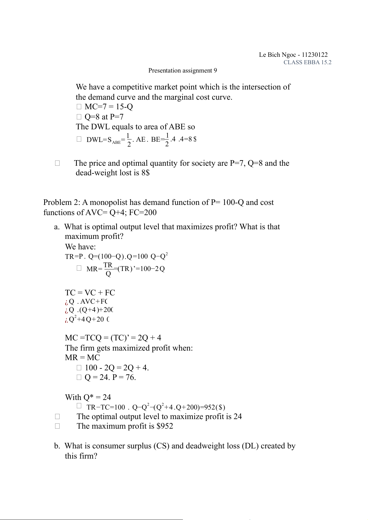 market)? Identify dead-weight loss (DL) created by this firm? Le Bich Ngoc - 11230122 CLASS EBBA 15.2 Presentation assignment 9