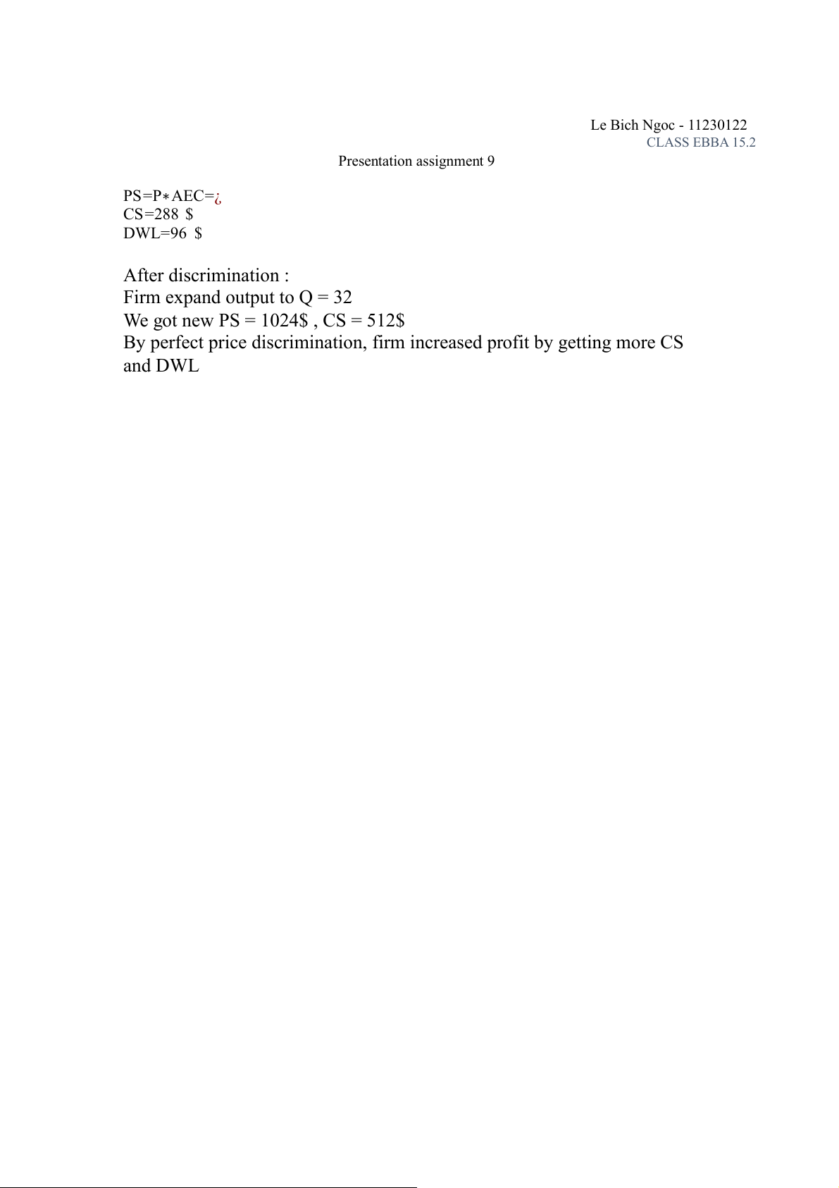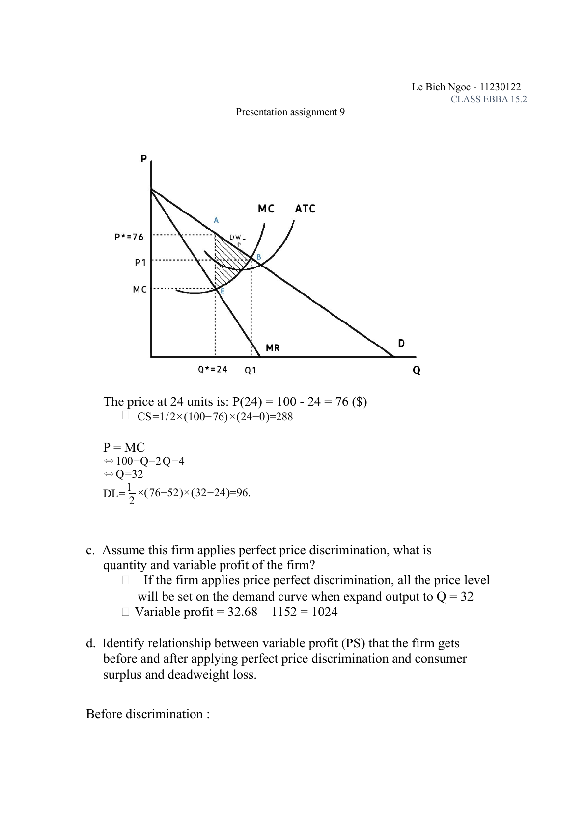 b. What is consumer surplus (CS) and deadweight loss (DL) created by this firm? Le Bich Ngoc - 11230122 CLASS EBBA 15.2 Presentation assignment 9