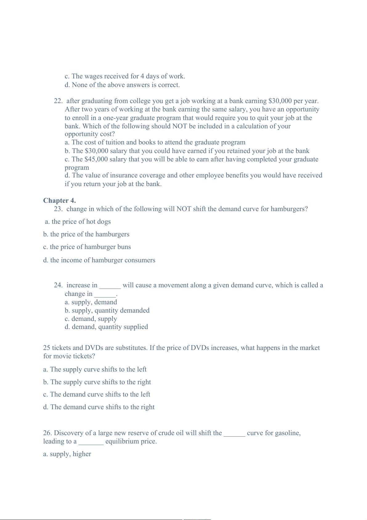 2. Your opportunity cost of going to a movie is a. The price of ticket.