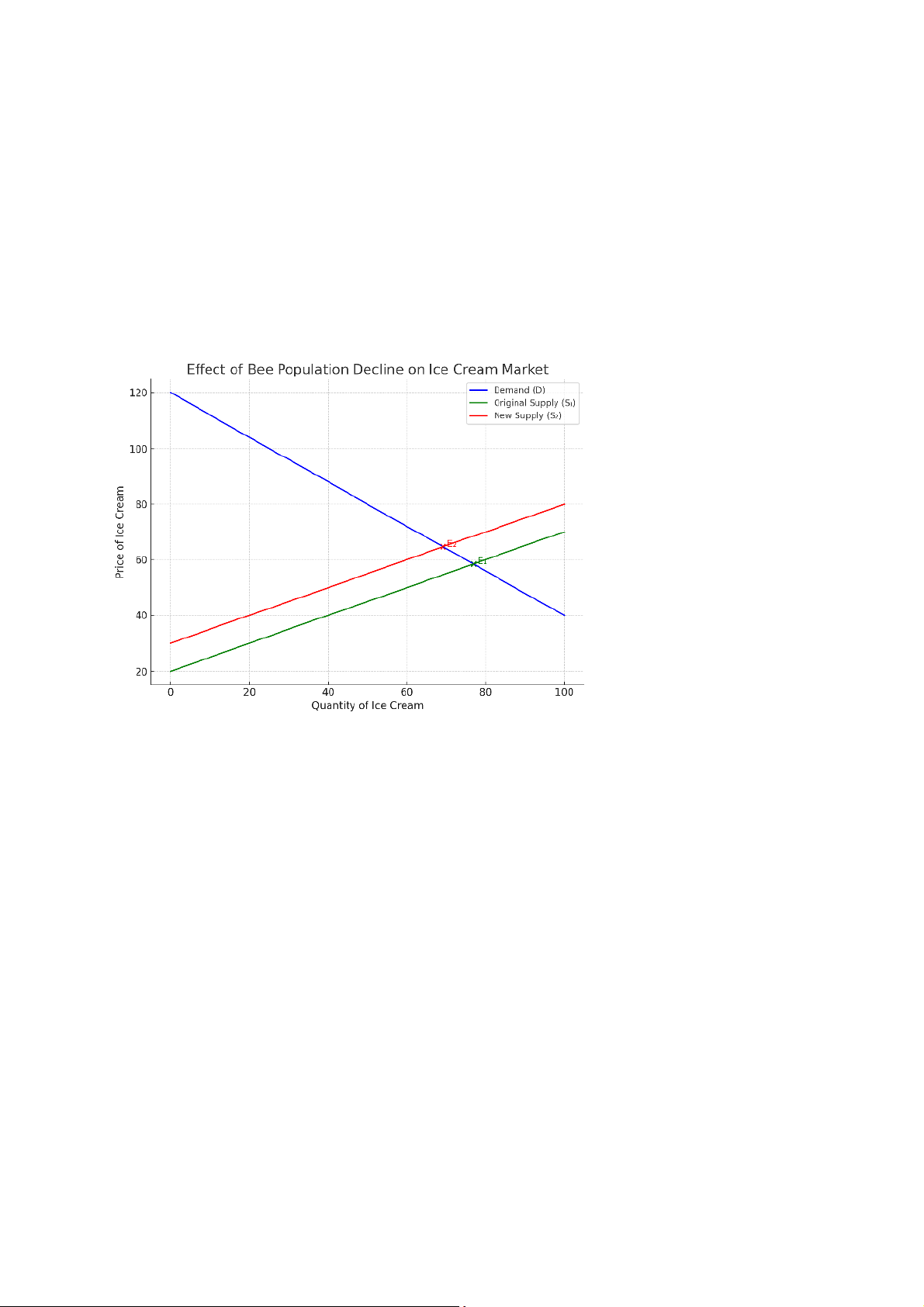 The decline in the bee population reduces pollination, which decreases the supply of strawberries,