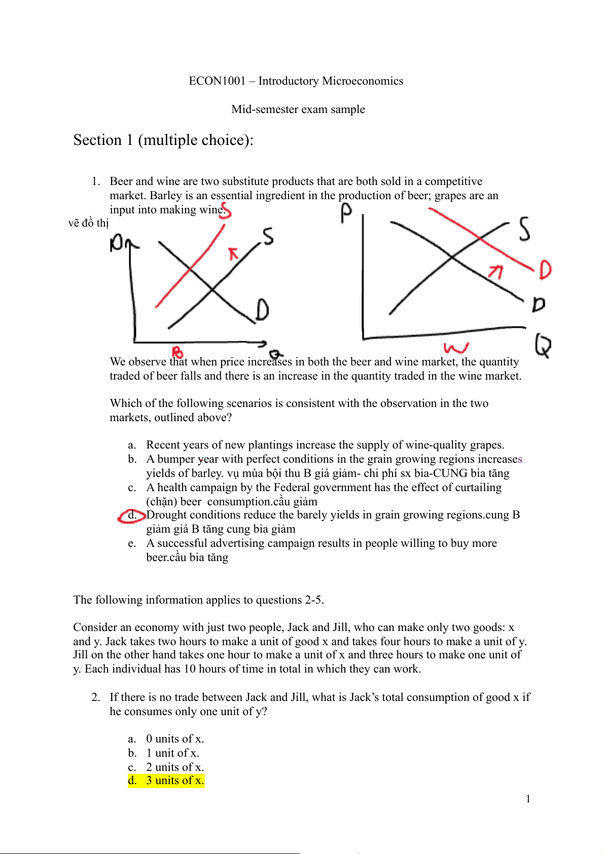 ECON1001 – Introductory Microeconomics Mid-semester exam sample Section 1 (multiple choice):