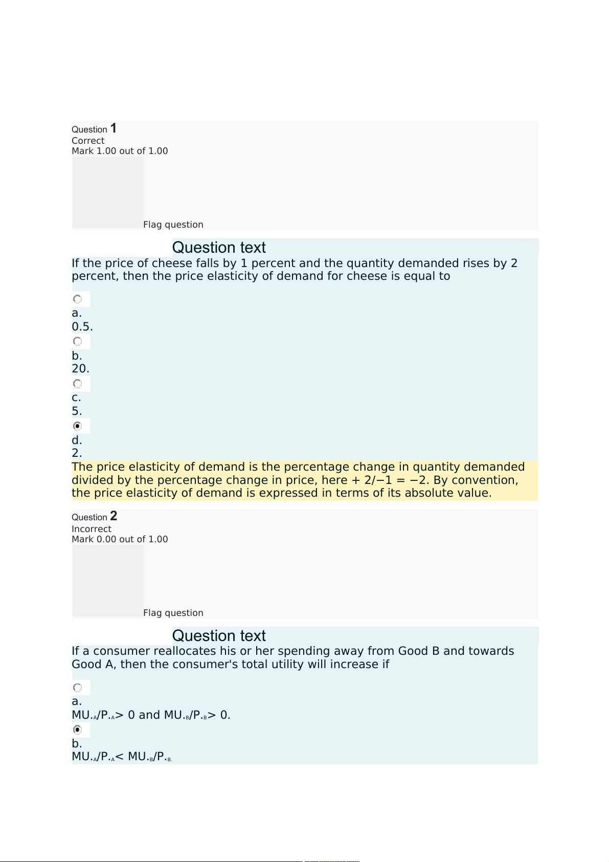 will be more than compensated for by the increase in utility from spending a dollar more on Good A. c. MU. < 0 and MU. < 0. A/P.A B/P.B d. MU. > MU. A/P.A B/P.B. Question3 Correct Mark 1.00 out of 1.00 Flag question Questiontext
