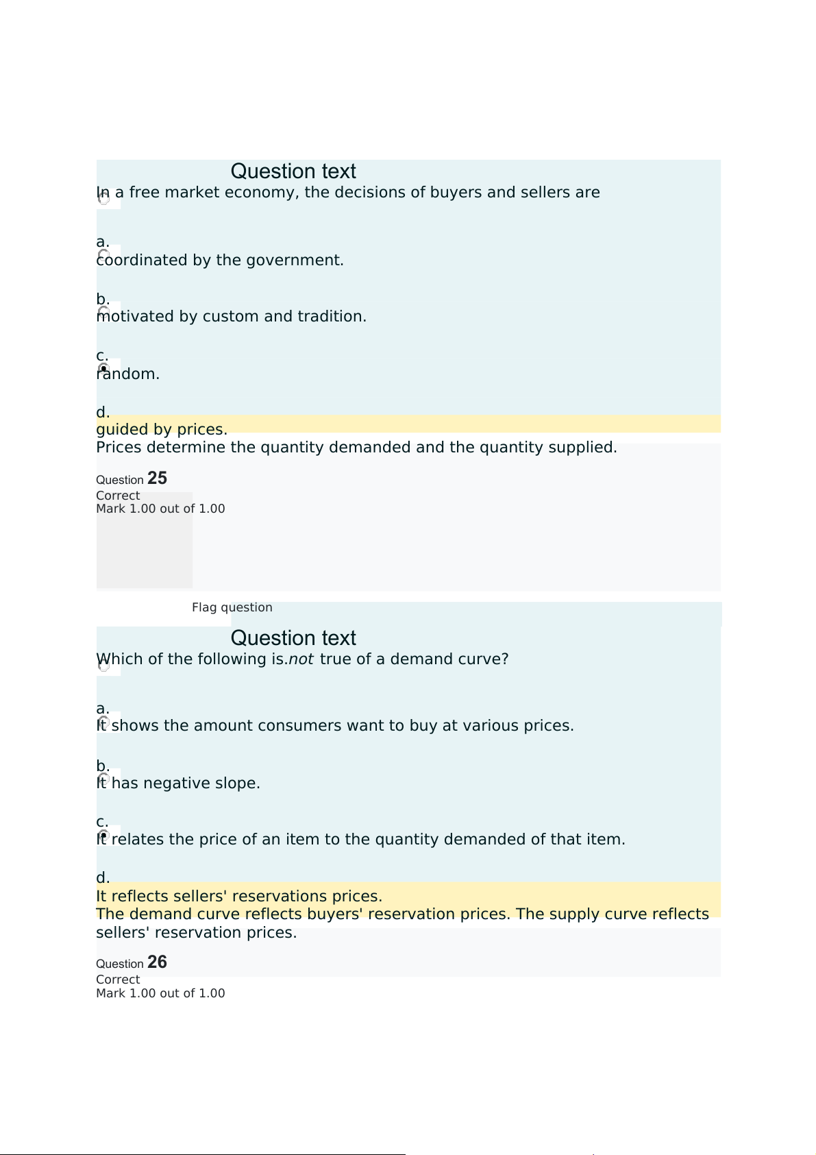 The demand curve reflects buyers' reservation prices. The supply curve reflects sellers' reservation prices. Question26 Correct Mark 1.00 out of 1.00 Flag question Questiontext