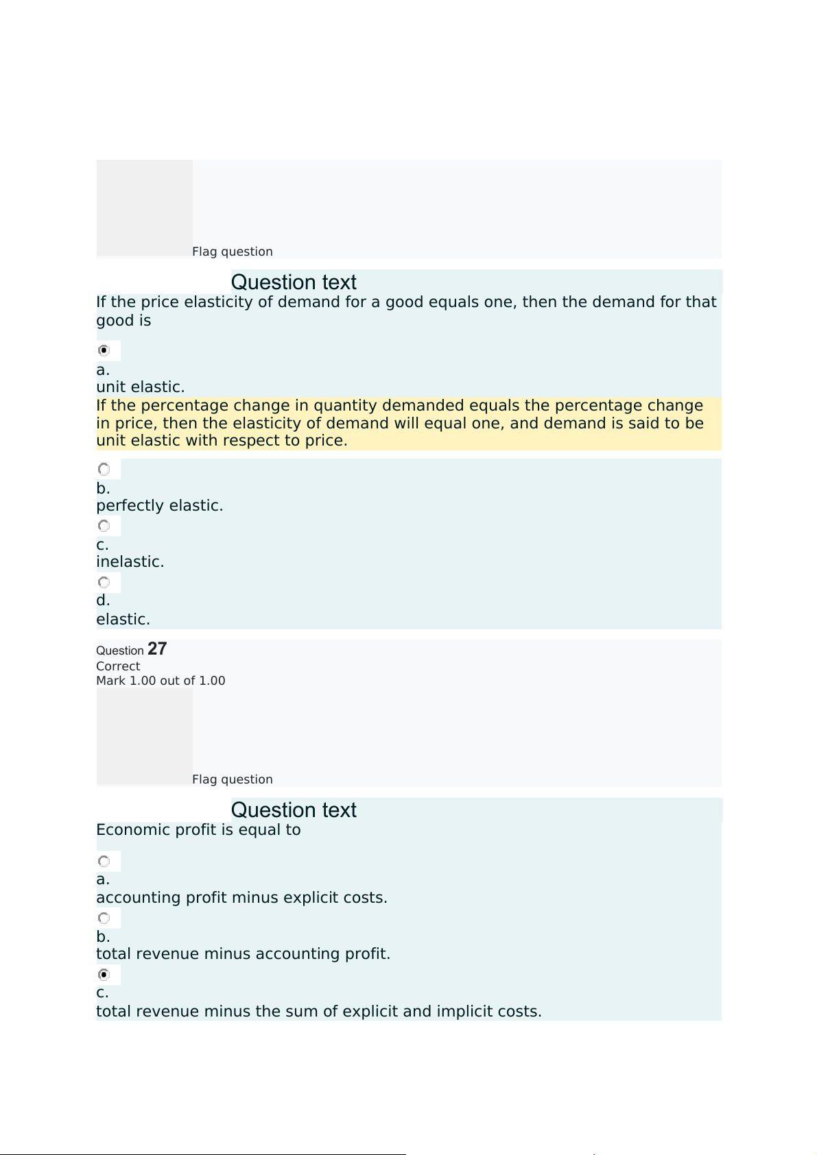 unit elastic with respect to price. b. perfectly elastic. c. inelastic. d. elastic. Question27 Correct Mark 1.00 out of 1.00 Flag question Questiontext Economic profit is equal to a.