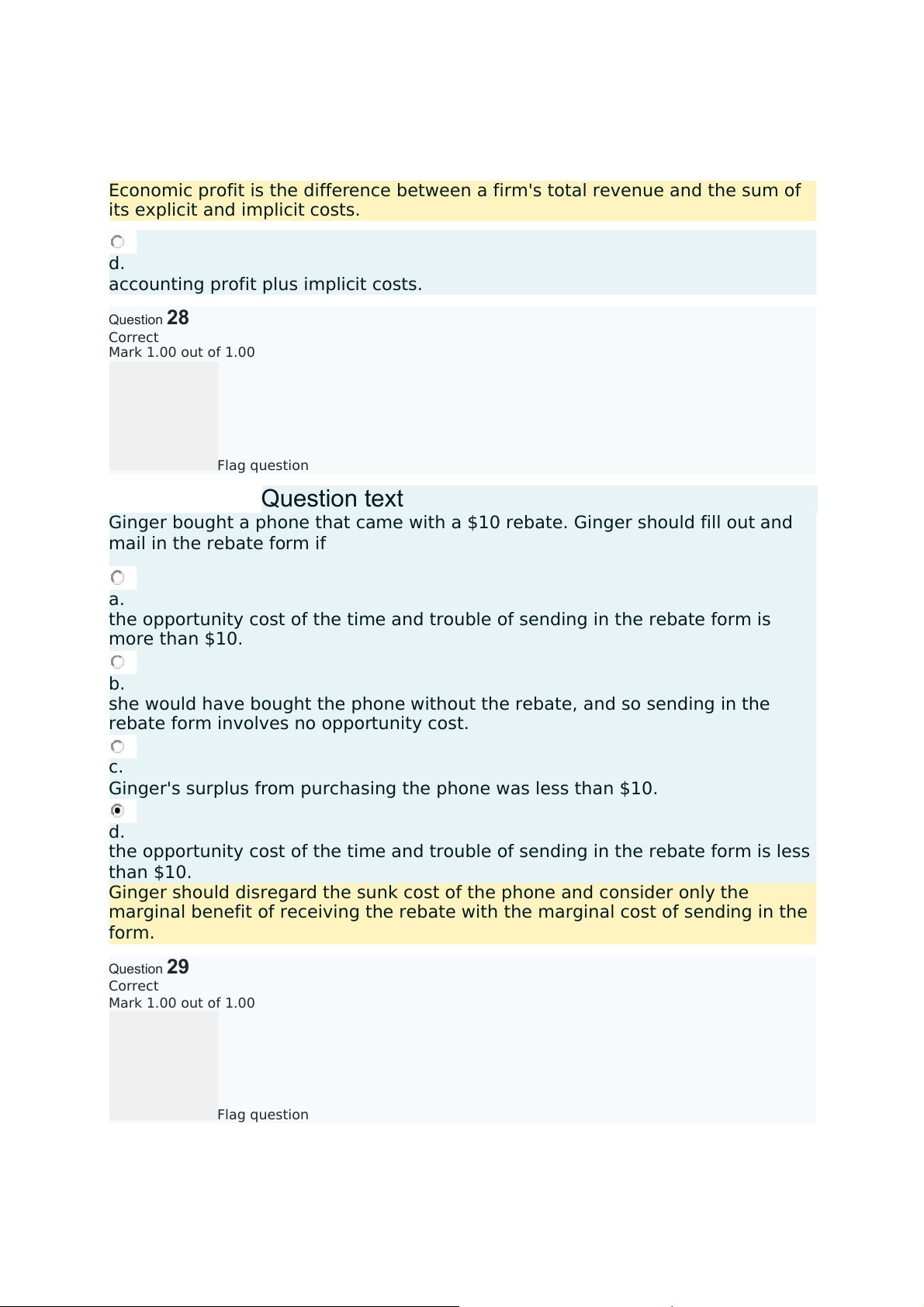 accounting profit plus implicit costs. Question28 Correct Mark 1.00 out of 1.00 Flag question Questiontext