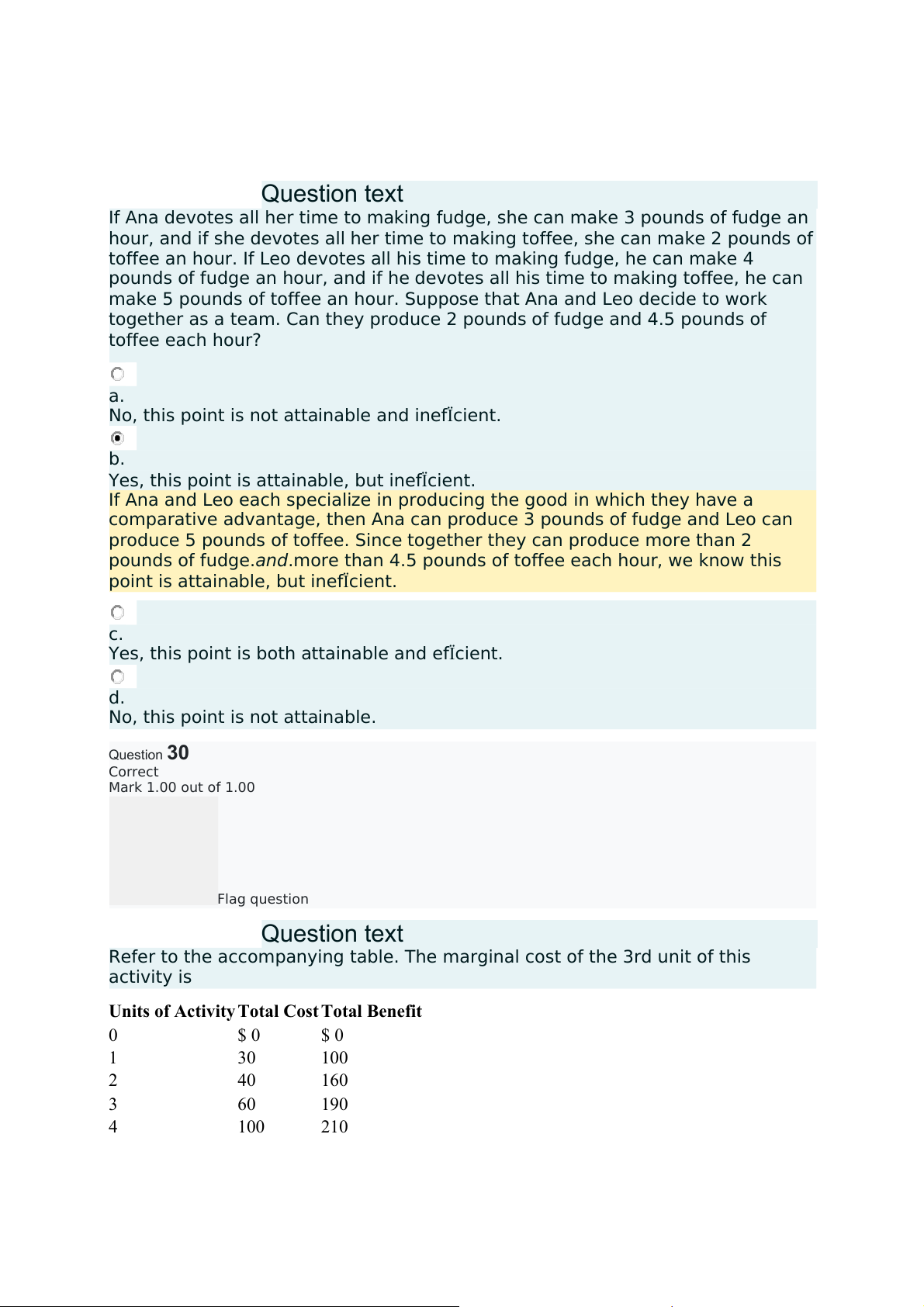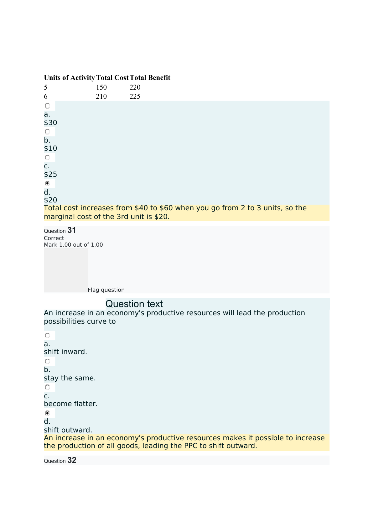 marginal cost of the 3rd unit is $20. Question31 Correct Mark 1.00 out of 1.00 Flag question Questiontext