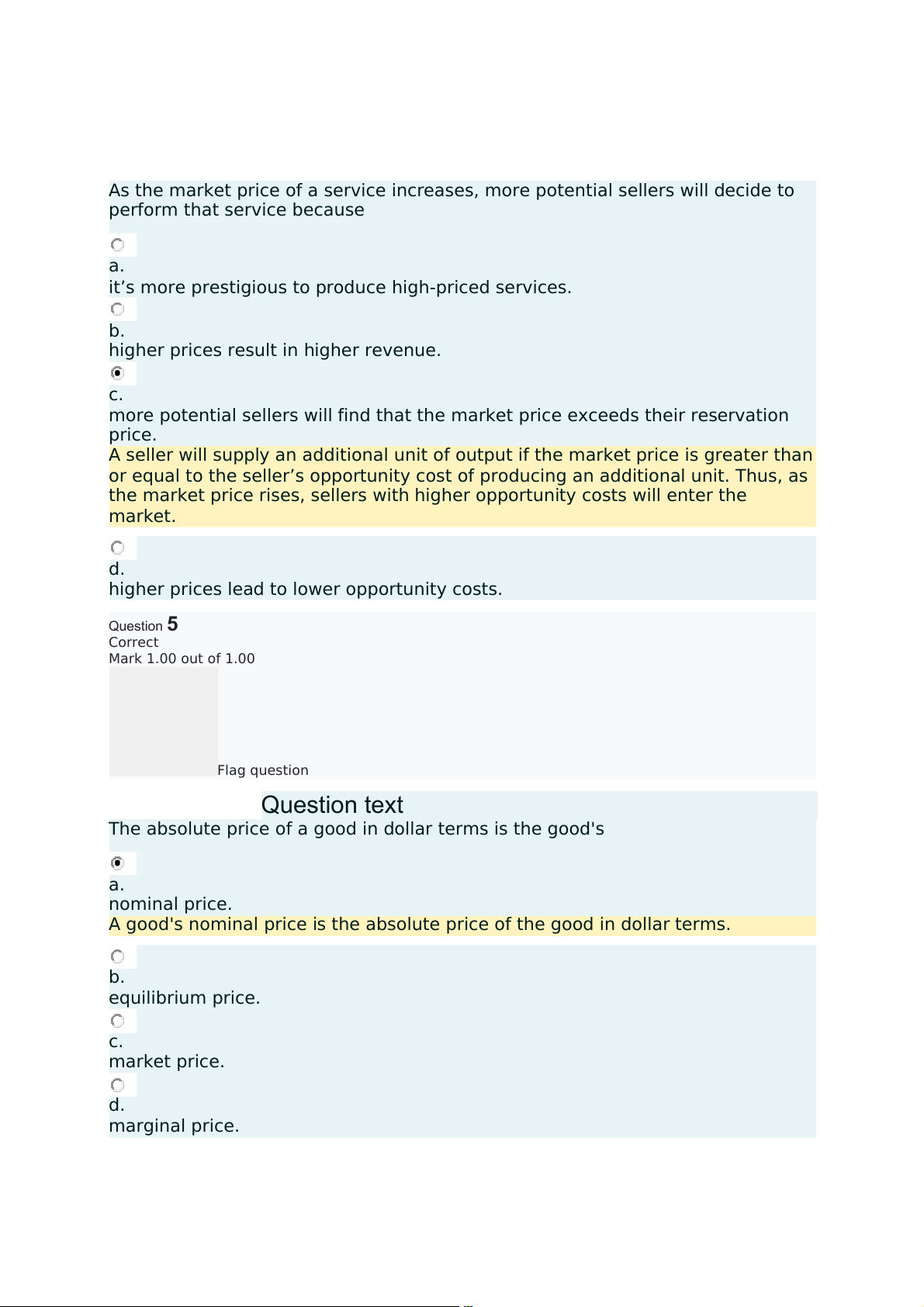 higher prices lead to lower opportunity costs. Question5 Correct Mark 1.00 out of 1.00 Flag question Questiontext