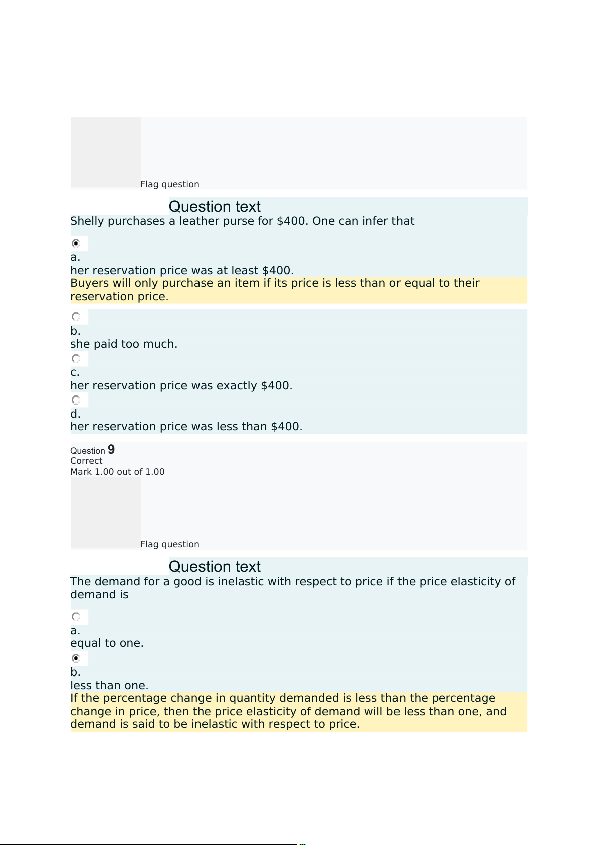 her reservation price was less than $400. Question9 Correct Mark 1.00 out of 1.00 Flag question Questiontext