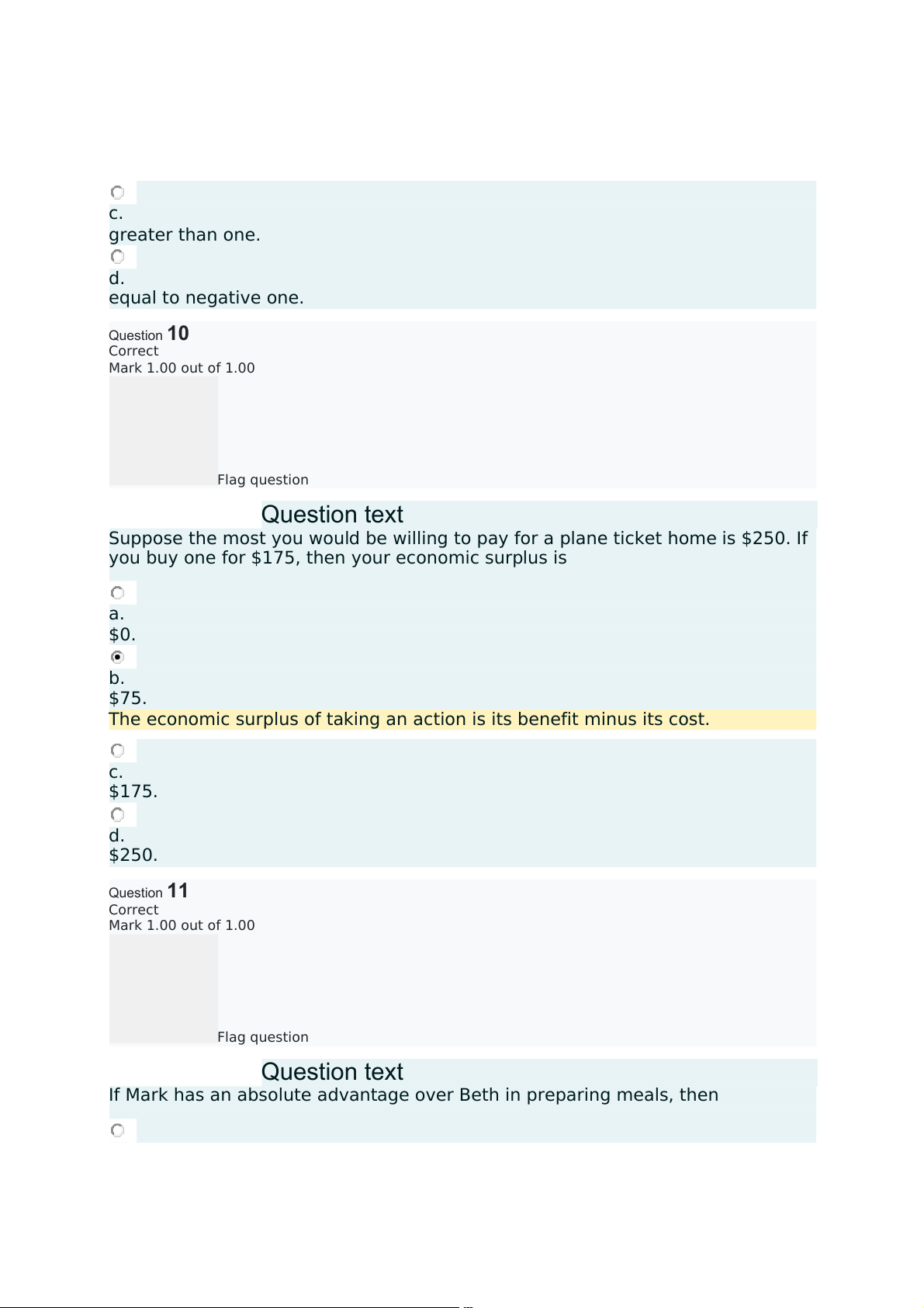 The economic surplus of taking an action is its benefit minus its cost. c. $175. d. $250. Question11 Correct Mark 1.00 out of 1.00 Flag question Questiontext