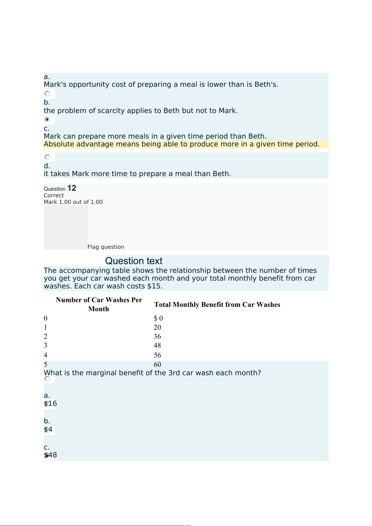 marginal benefit of the 3rd car wash is $12. Question13 Correct Mark 1.00 out of 1.00 Flag question Questiontext