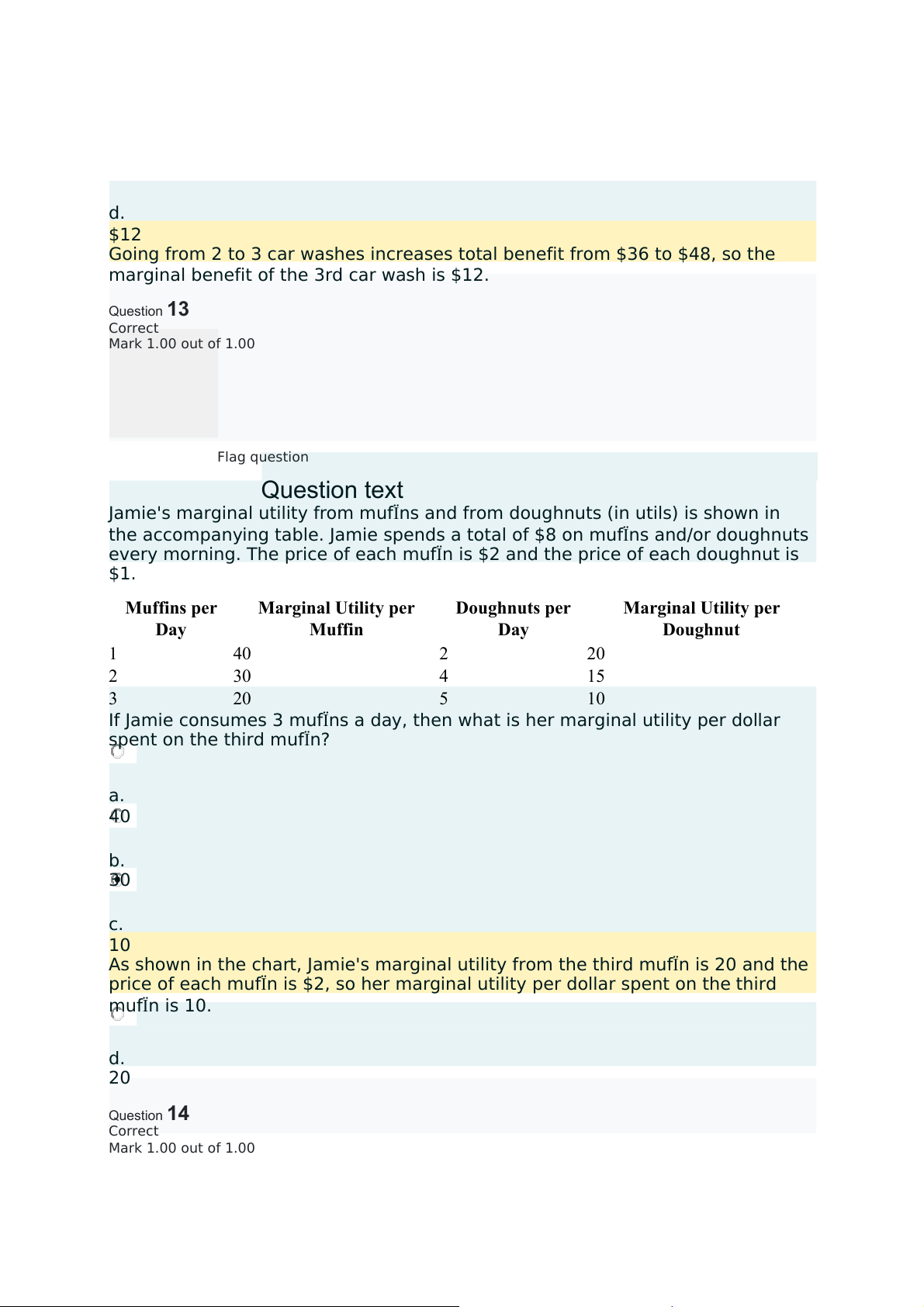 price of each mufÏn is $2, so her marginal utility per dollar spent on the third mufÏn is 10. d. 20 Question14 Correct Mark 1.00 out of 1.00 Flag question Questiontext