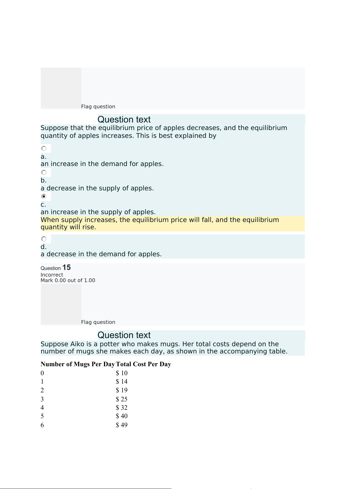 a decrease in the demand for apples. Question15 Incorrect Mark 0.00 out of 1.00 Flag question Questiontext