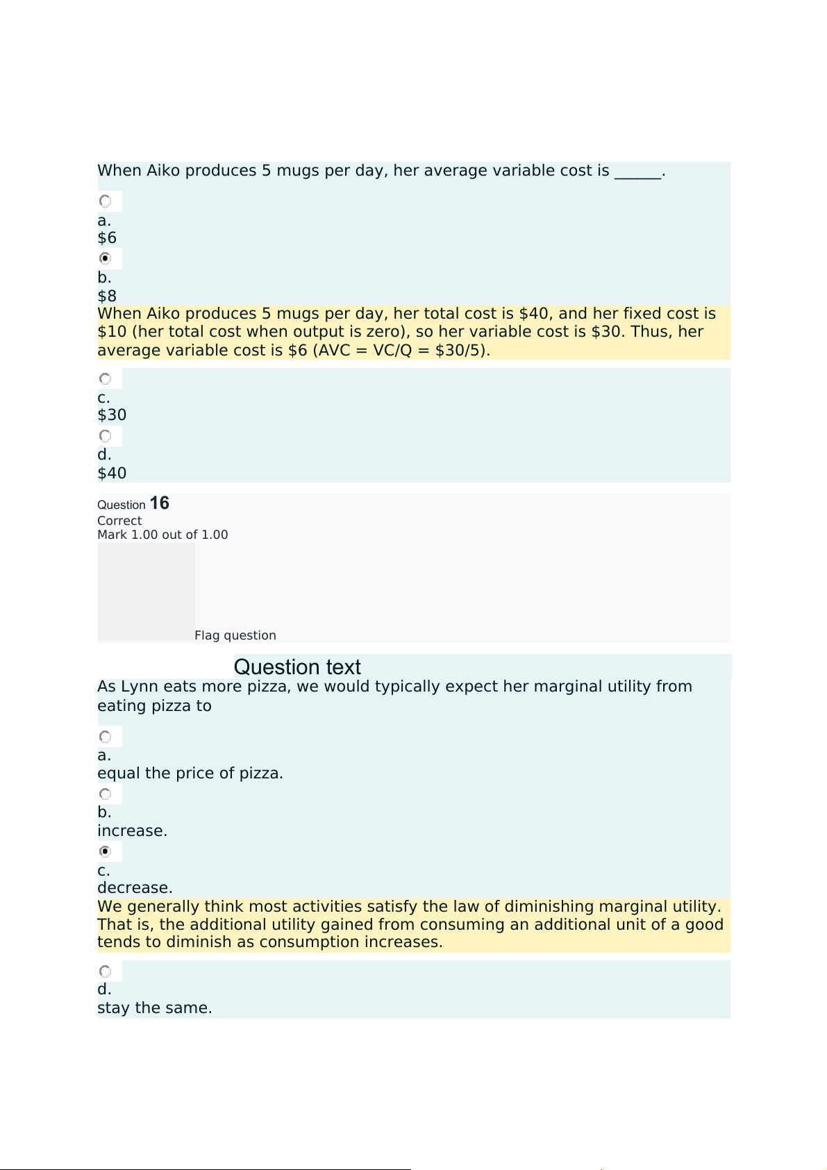 average variable cost is $6 (AVC = VC/Q = $30/5). c. $30 d. $40 Question16 Correct Mark 1.00 out of 1.00 Flag question Questiontext