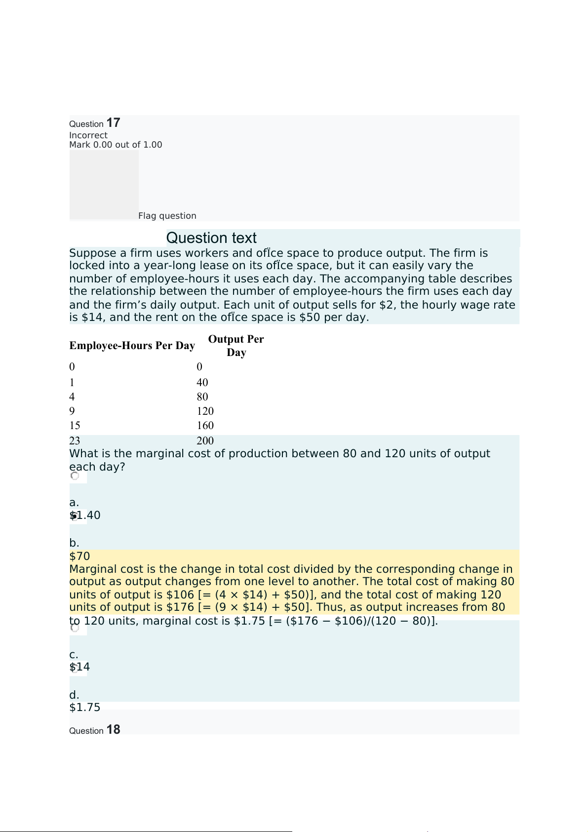 to 120 units, marginal cost is $1.75 [= ($176 − $106)/(120 − 80)]. c. $14 d. $1.75 Question18 Correct Mark 1.00 out of 1.00 Flag question Questiontext