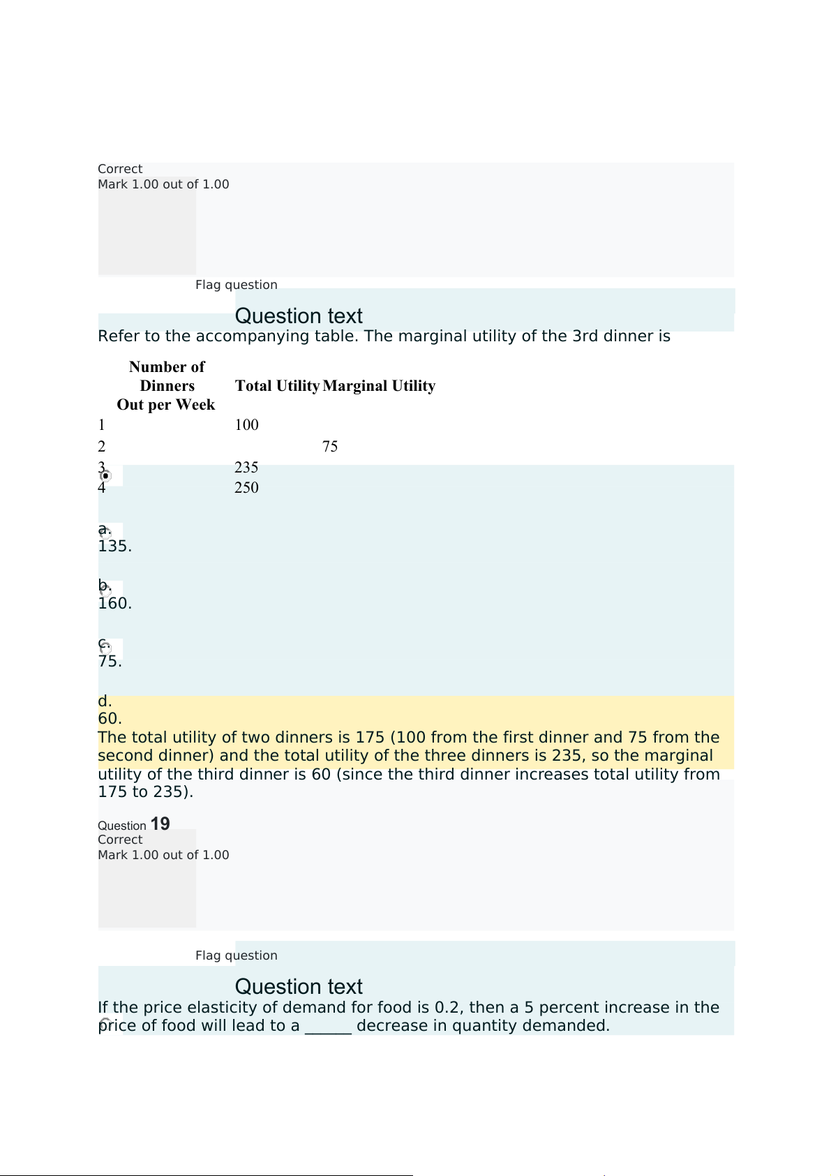 utility of the third dinner is 60 (since the third dinner increases total utility from 175 to 235). Question19 Correct Mark 1.00 out of 1.00 Flag question Questiontext