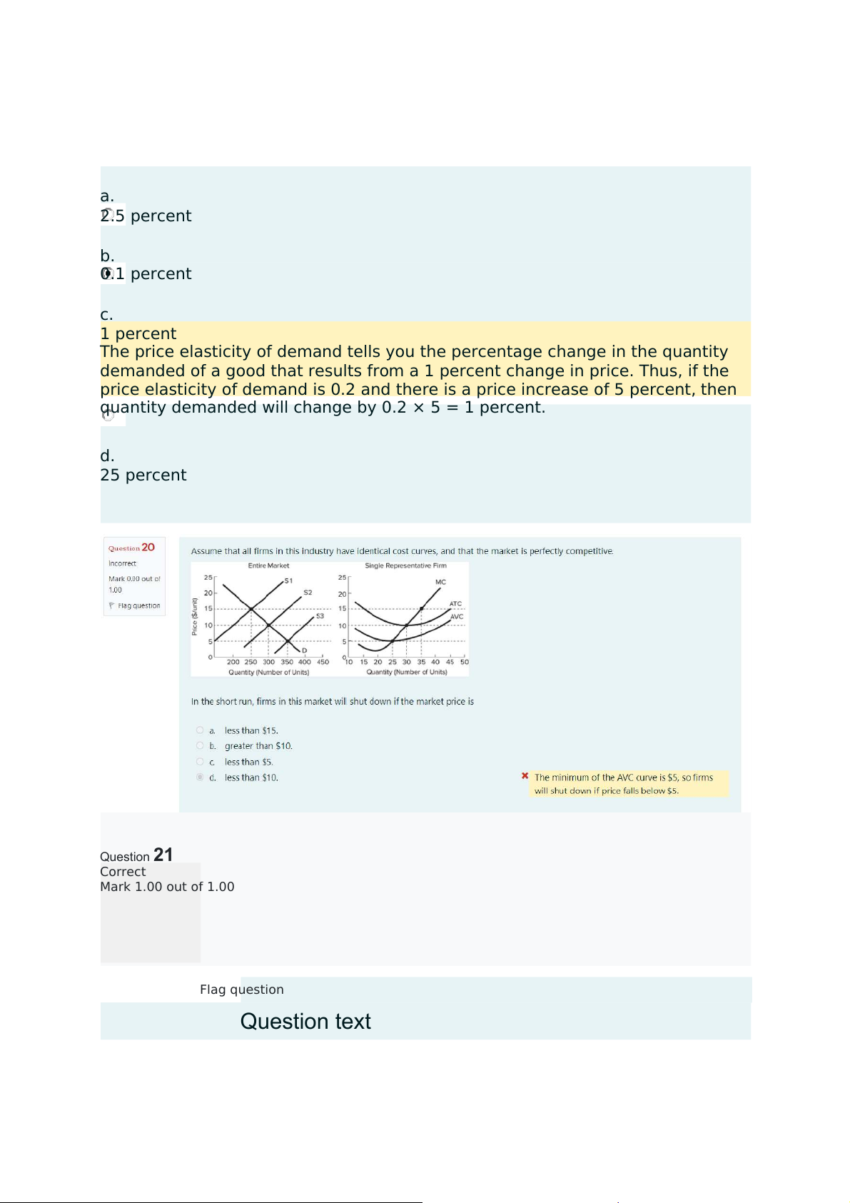 quantity demanded will change by 0.2 × 5 = 1 percent. d. 25 percent Question21 Correct Mark 1.00 out of 1.00 Flag question Questiontext