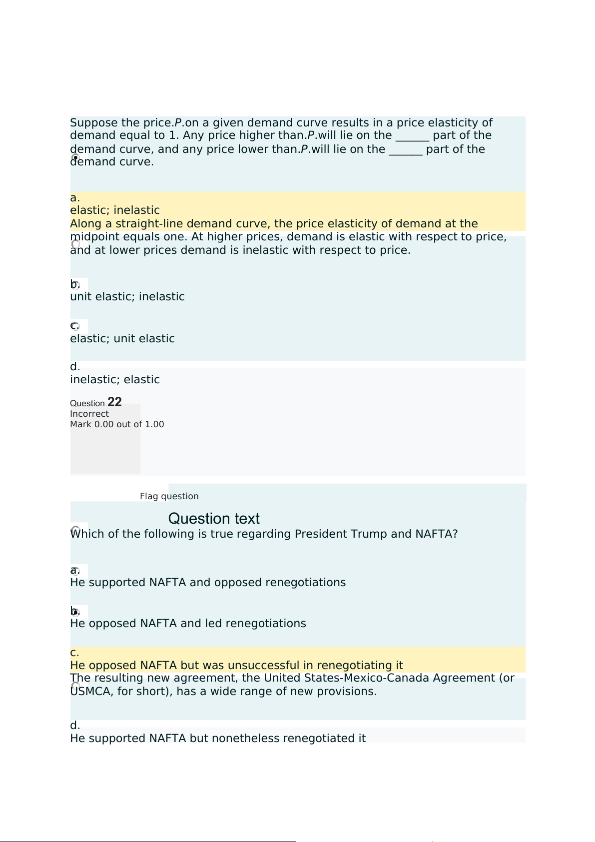 He supported NAFTA but nonetheless renegotiated it Question23 Incorrect Mark 0.00 out of 1.00 Flag question Questiontext
