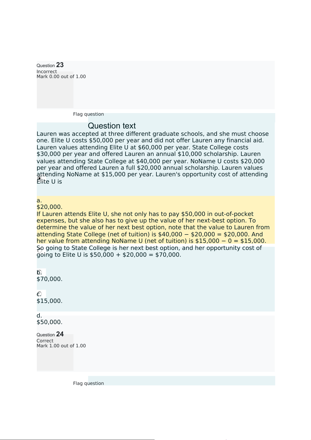 going to Elite U is $50,000 + $20,000 = $70,000. b. $70,000. c. $15,000. d. $50,000. Question24 Correct Mark 1.00 out of 1.00 Flag question Questiontext