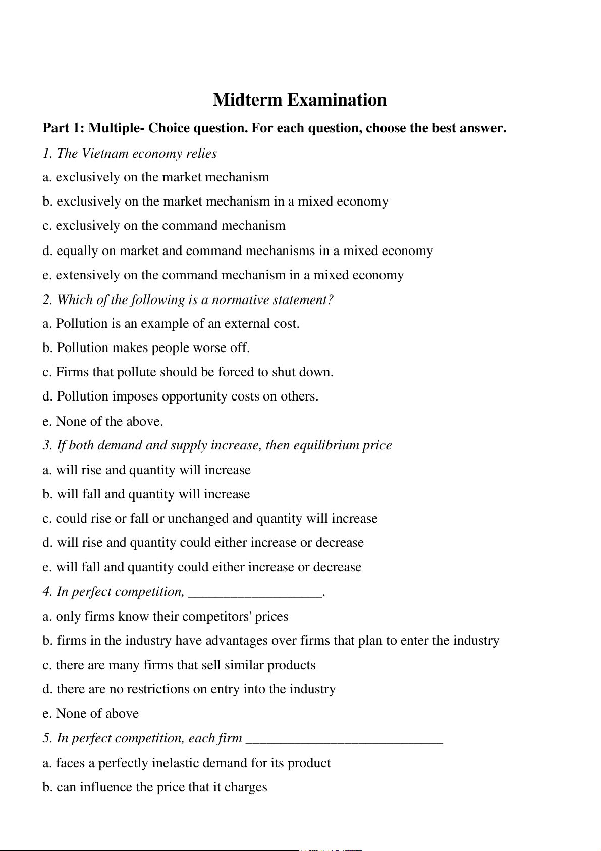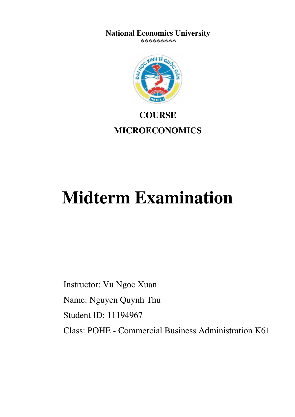 National Economics University ********* COURSE MICROECONOMICS Midterm Examination Instructor: Vu Ngoc Xuan Name: Nguyen Quynh Thu Student ID: 11194967