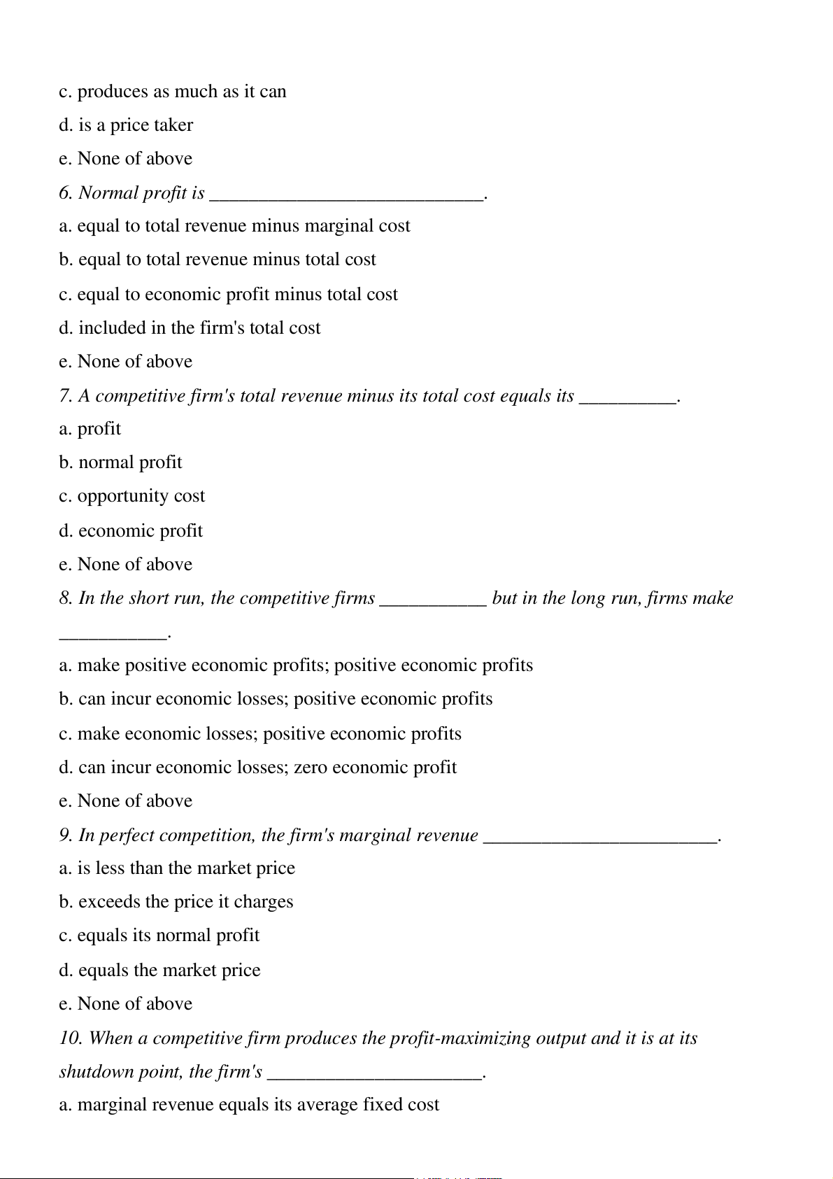 d. total revenue equals its total variable cost e. None of above Question 1 2 3 4 5 6 7 8 9 10 Answer D C C D D B B B D E