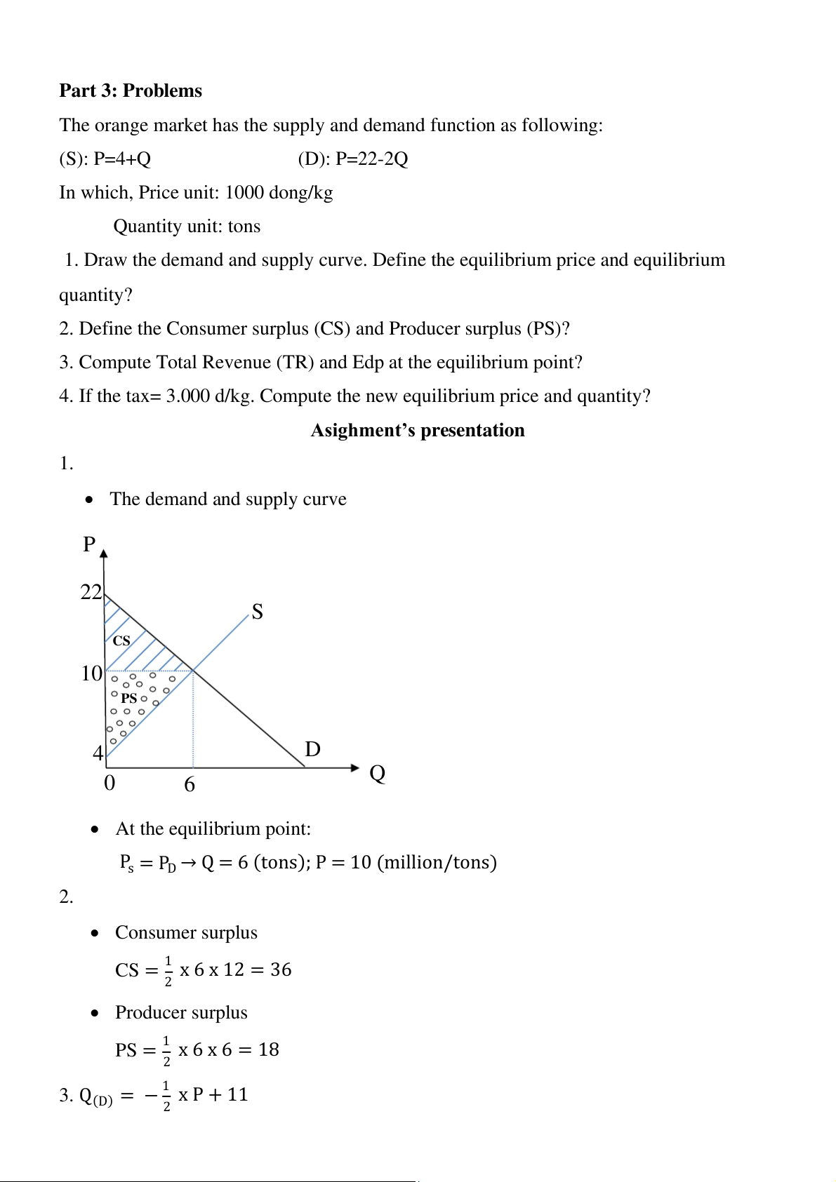 s = PD → Q = 6 (tons); P = 10 (million/tons) 2. • Consumer surplus CS 1 = x 6 x 12 = 36 2 • Producer surplus PS 1 = x 6 x 6 = 18 2 3. 1 Q(D) = − x P + 11 2