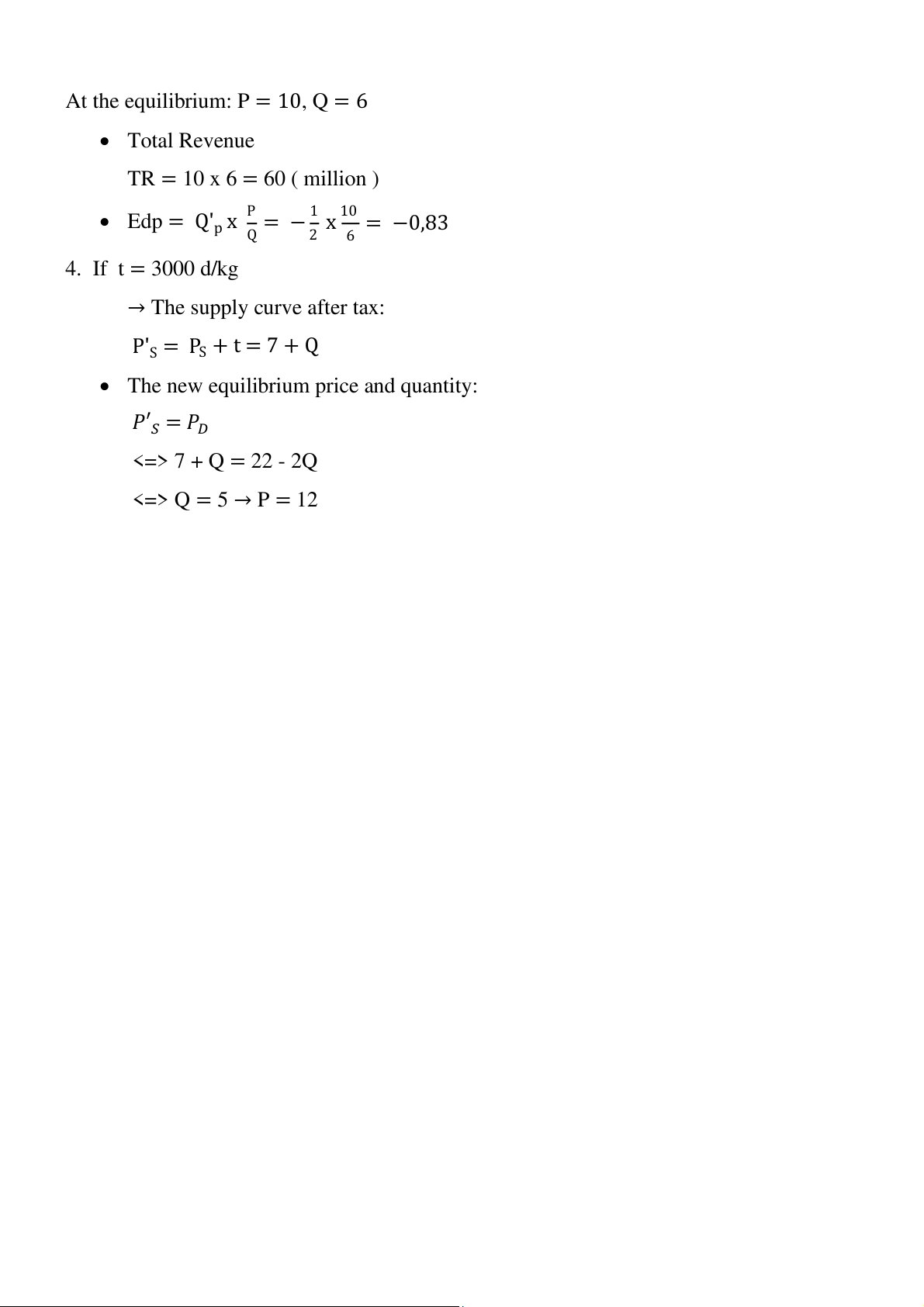 At the equilibrium: P = 10, Q = 6 • Total Revenue TR = 10 x 6 = 60 ( million ) P 1 10 • Edp = Q'p x = − x = −0,83 Q 2 6 4. If t = 3000 d/kg