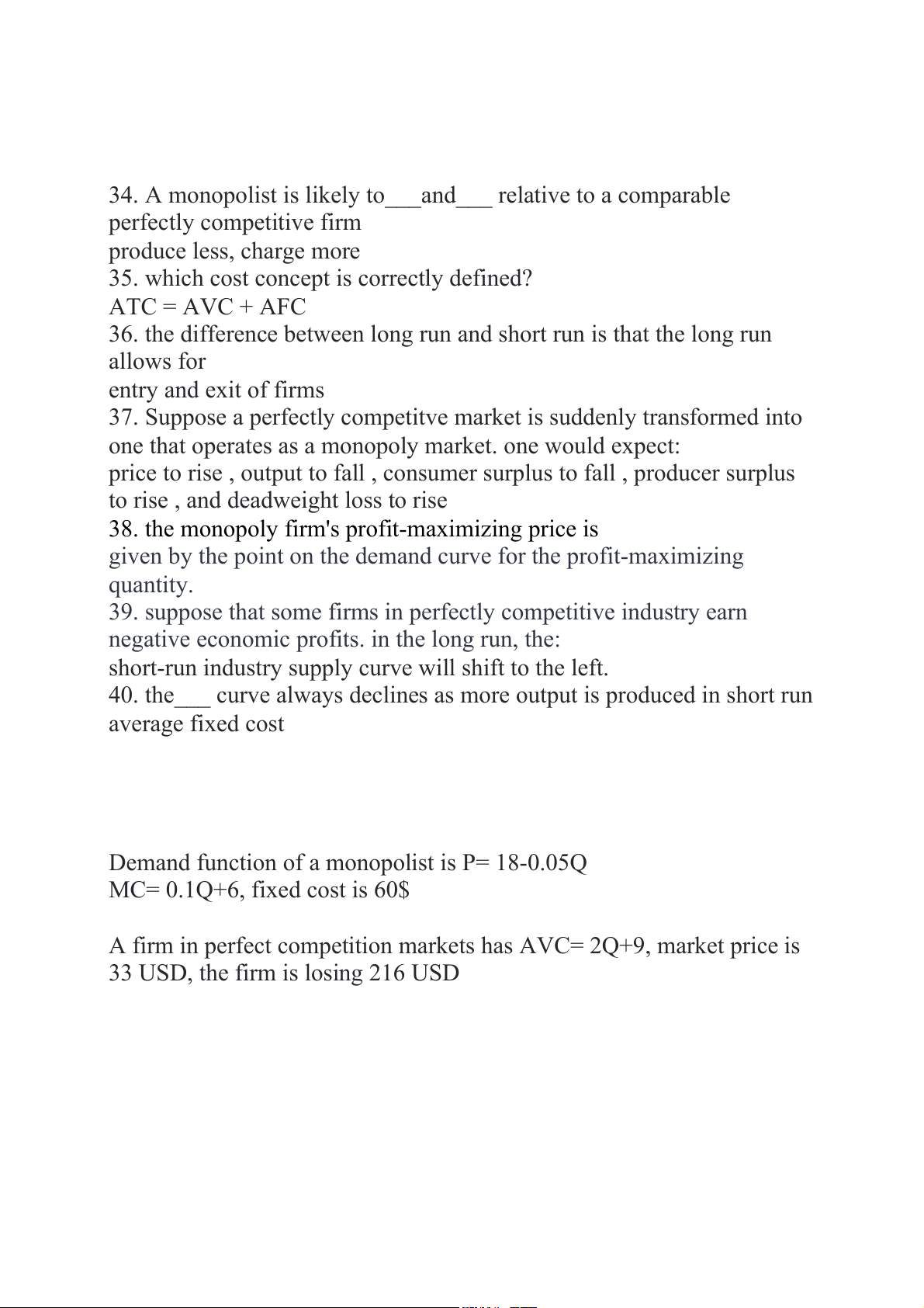 34. A monopolist is likely to___and___ relative to a comparable perfectly competitive firm produce less, charge more