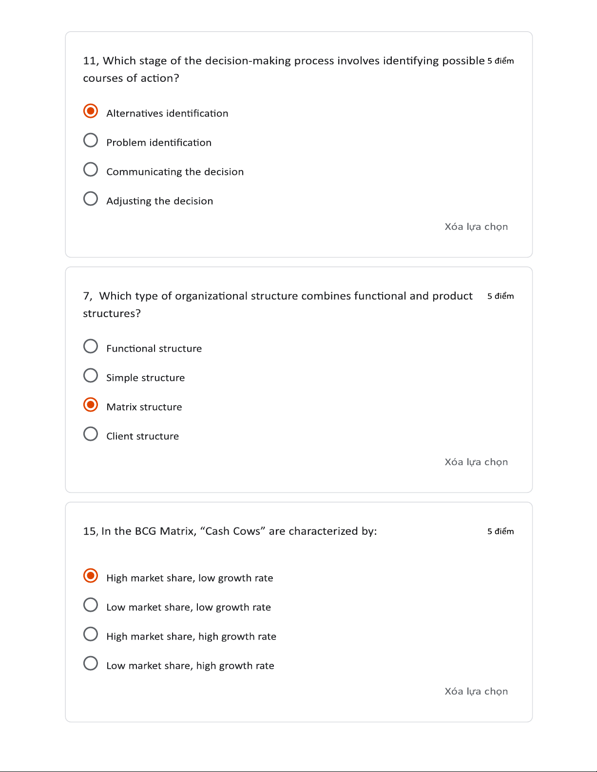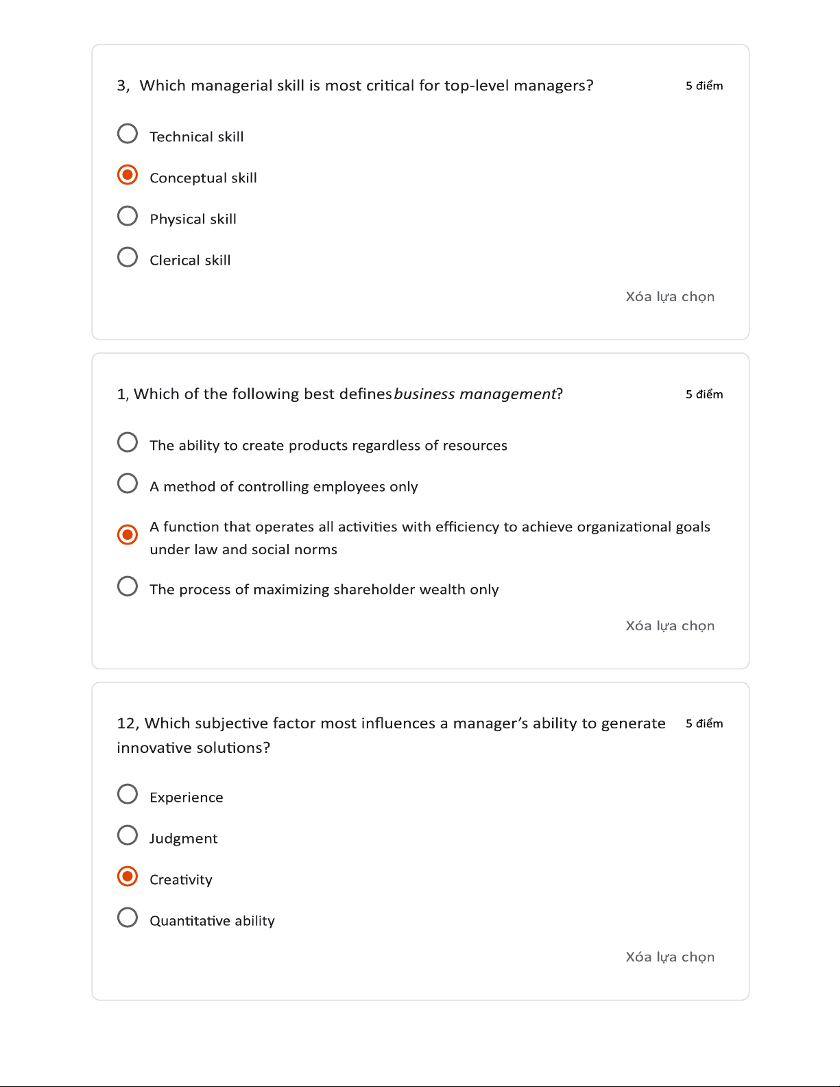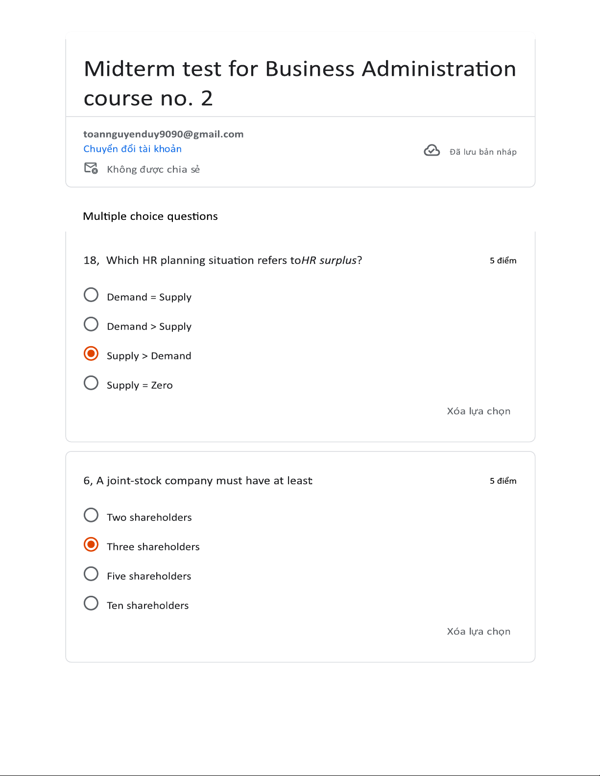 Midterm test for Business Administration course no. 2 Gửi Xóa hết câu trả lời