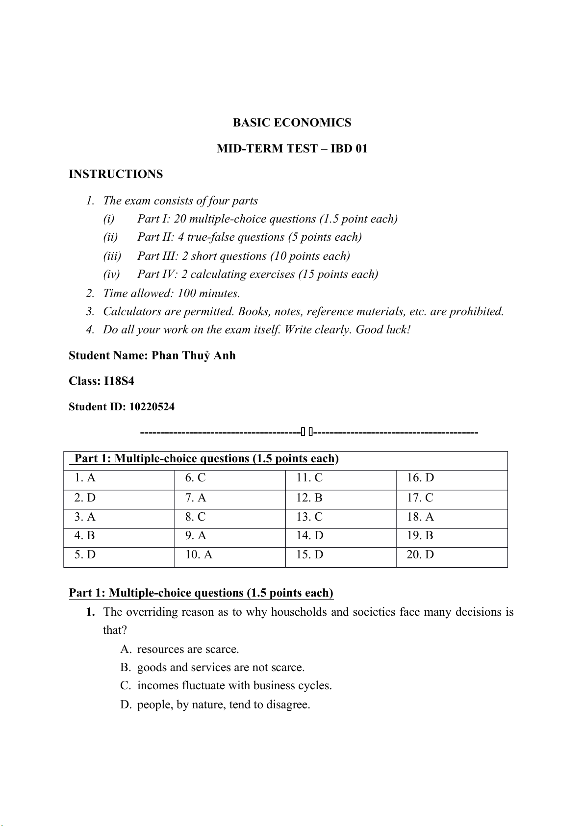 Part 1: Multiple-choice questions (1.5 points each) 1. A 6. C 11. C 16. D 2. D 7. A 12. B 17. C 3. A 8. C 13. C 18. A 4. B 9. A 14. D 19. B 5. D 10. A 15. D 20. D