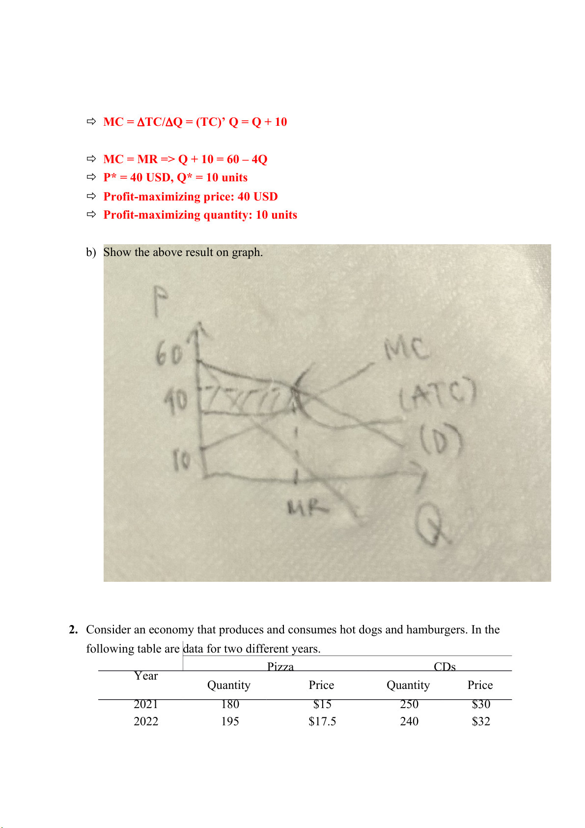 following table are data for two different years. Pizza CDs Year Quantity Price Quantity Price 2021 180 $15 250 $30 2022 195 $17.5 240 $32