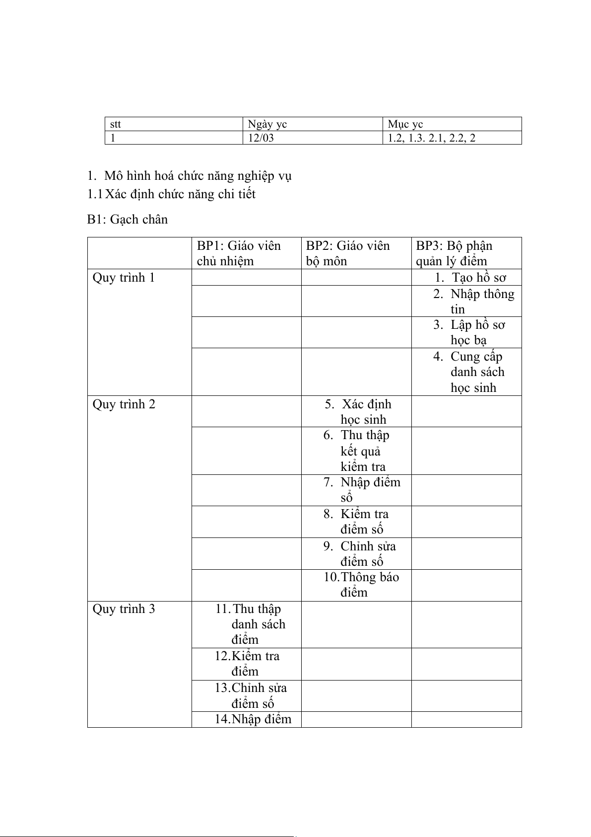 1.1Xác định chức năng chi tiết B1: Gạch chân BP1: Giáo viên BP2: Giáo viên BP3: Bộ phận chủ nhiệm bộ môn quản lý điểm Quy trình 1 1. Tạo hồ sơ 2. Nhập thông tin 3. Lập hồ sơ học bạ 4. Cung cấp danh sách học sinh Quy trình 2 5. Xác định học sinh 6. Thu thập kết quả kiểm tra 7. Nhập điểm sổ 8. Kiểm tra điểm số 9. Chỉnh sửa điểm số 10.Thông báo điểm Quy trình 3 11.Thu thập danh sách điểm 12.Kiểm tra điểm 13.Chỉnh sửa điểm số 14.Nhập điểm Quy trình 4 15.Tổng hợp điểm 16.Tạo báo cáo 17.Phân loại báo cáo 18.Kiểm tra báo cáo 19. Gửi báo cáo Quy trình 5 20.Xếp loại học lực 21.Tổng hợp danh sách học sinh 22.Xác định tiêu chí 23.Kiểm tra danh sách 24.Trao thưởng phần thưởng