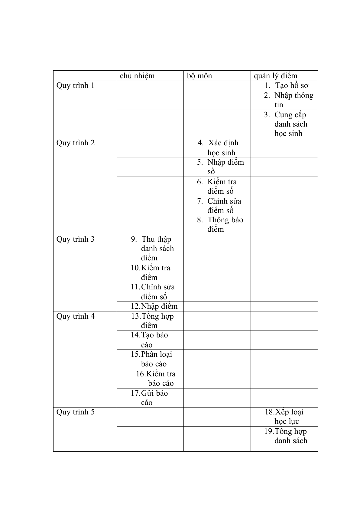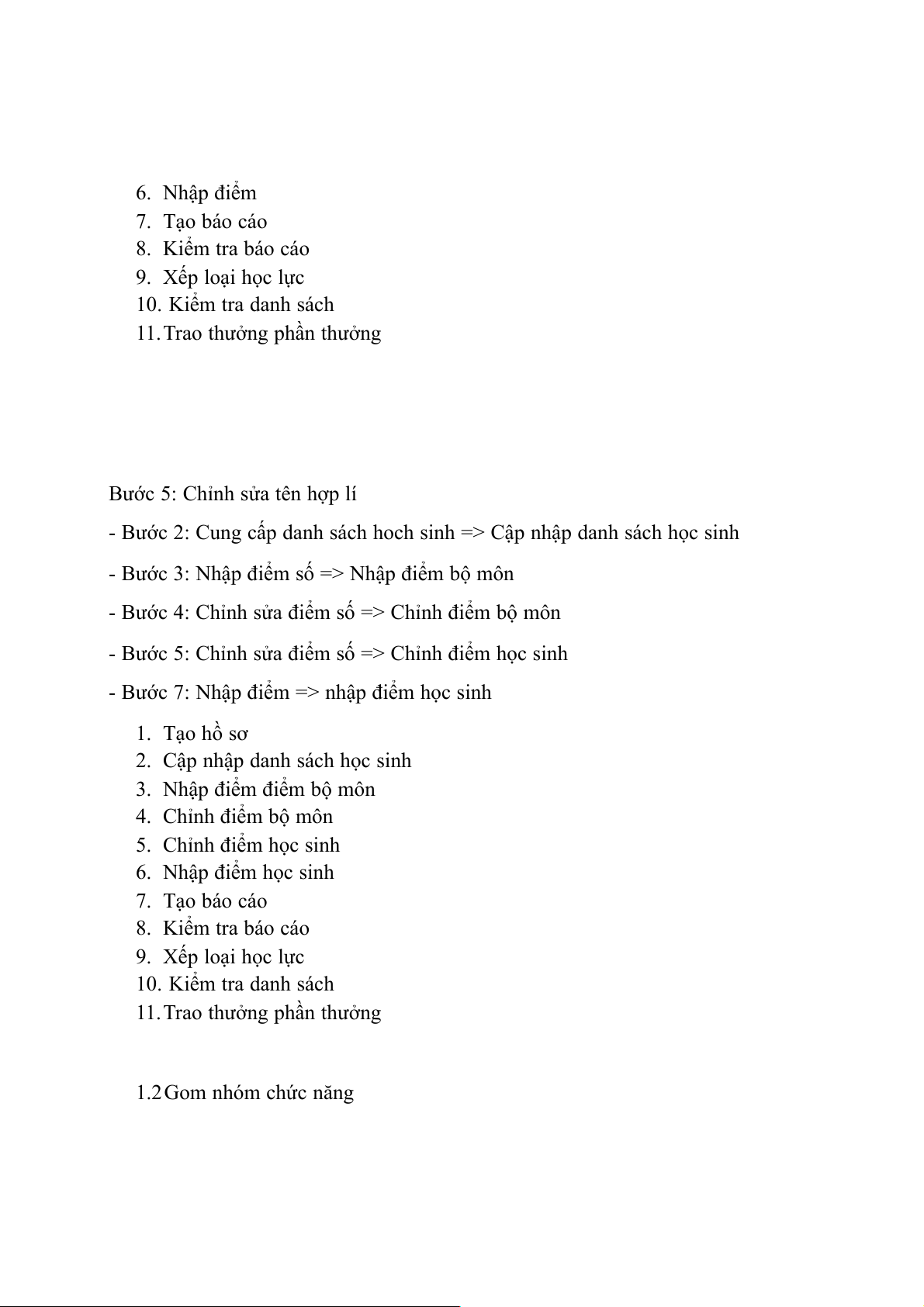 3. Nhập điểm điểm bộ môn 4. Chỉnh điểm bộ môn 5. Chỉnh điểm học sinh 6. Nhập điểm học sinh 7. Tạo báo cáo 8. Kiểm tra báo cáo 9. Xếp loại học lực 10. Kiểm tra danh sách