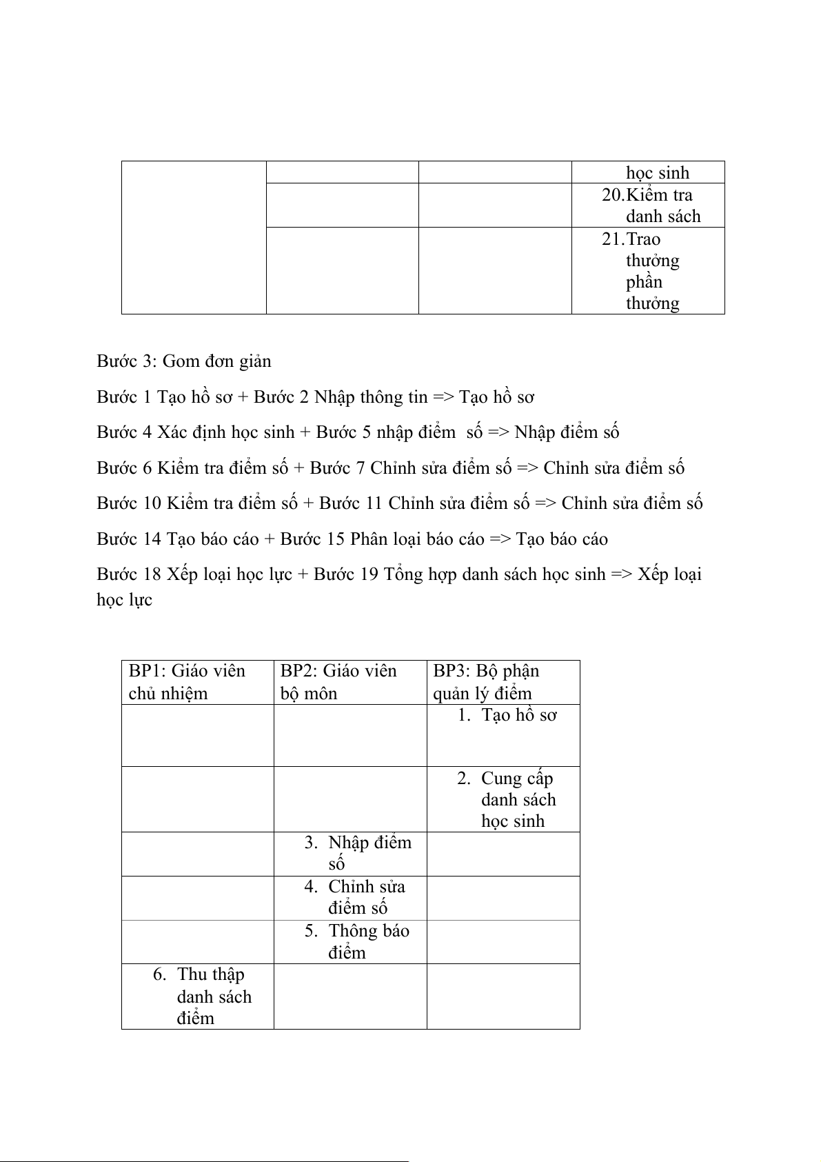 Bước 18 Xếp loại học lực + Bước 19 Tổng hợp danh sách học sinh => Xếp loại học lực BP1: Giáo viên BP2: Giáo viên BP3: Bộ phận chủ nhiệm bộ môn quản lý điểm 1. Tạo hồ sơ 2. Cung cấp danh sách học sinh 3. Nhập điểm số 4. Chỉnh sửa điểm số 5. Thông báo điểm 6. Thu thập danh sách điểm 7. Chỉnh sửa điểm số 8. Nhập điểm 9. Tổng hợp điểm 10.Tạo báo cáo 11.Kiểm tra báo cáo 12.Gửi báo cáo 13.Xếp loại học lực 14.Kiểm tra danh sách 15.Trao thưởng phần thưởng
