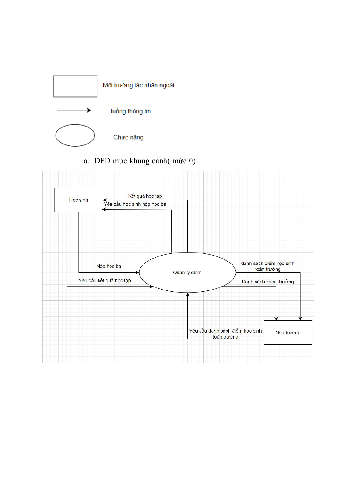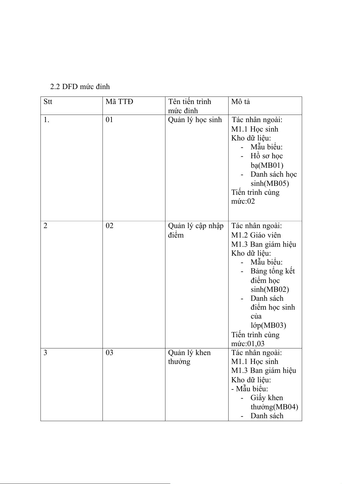 a. DFD mức khung cảnh( mức 0) 2.2 DFD mức đỉnh Stt Mã TTĐ Tên tiến trình Mô tả mức đỉnh 1. 01 Quản lý học sinh Tác nhân ngoài: M1.1 Học sinh Kho dữ liệu: - Mẫu biểu: - Hồ sơ học bạ(MB01) - Danh sách học sinh(MB05) Tiến trình cùng mức:02 2 02