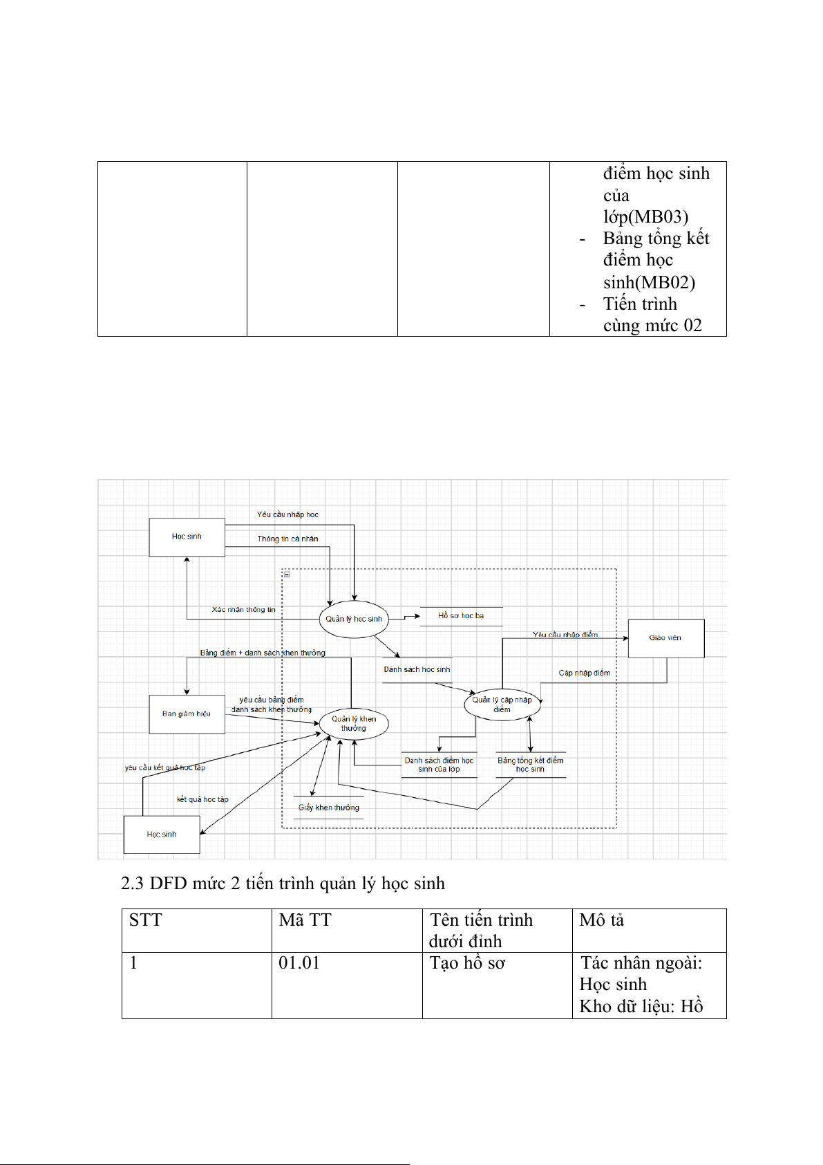 2.3 DFD mức 2 tiến trình quản lý học sinh STT Mã TT Tên tiến trình Mô tả dưới đỉnh 1 01.01 Tạo hồ sơ Tác nhân ngoài: Học sinh Kho dữ liệu: Hồ sơ học bạ(MB01), Danh sách học sinh(MB05) Tiến trình cùng mức liên quan: 01.02 2 01.02 Cập nhập danh Tác nhân ngoài: sách học sinh Học sinh Kho dữ liệu: Danh sách học sinh(MB05) Tiến trình cùng mức liên quan: 01.01