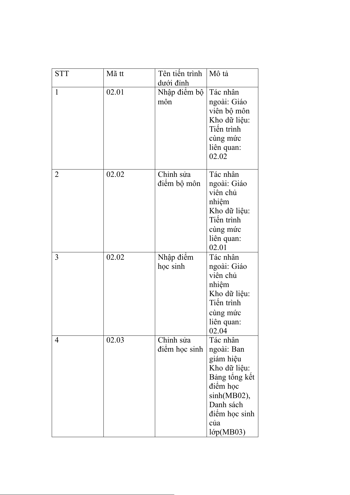 điểm bộ môn ngoài: Giáo viên chủ nhiệm Kho dữ liệu: Tiến trình cùng mức liên quan: 02.01 3 02.02 Nhập điểm Tác nhân học sinh ngoài: Giáo viên chủ nhiệm Kho dữ liệu: Tiến trình cùng mức liên quan: 02.04 4 02.03 Chỉnh sửa Tác nhân