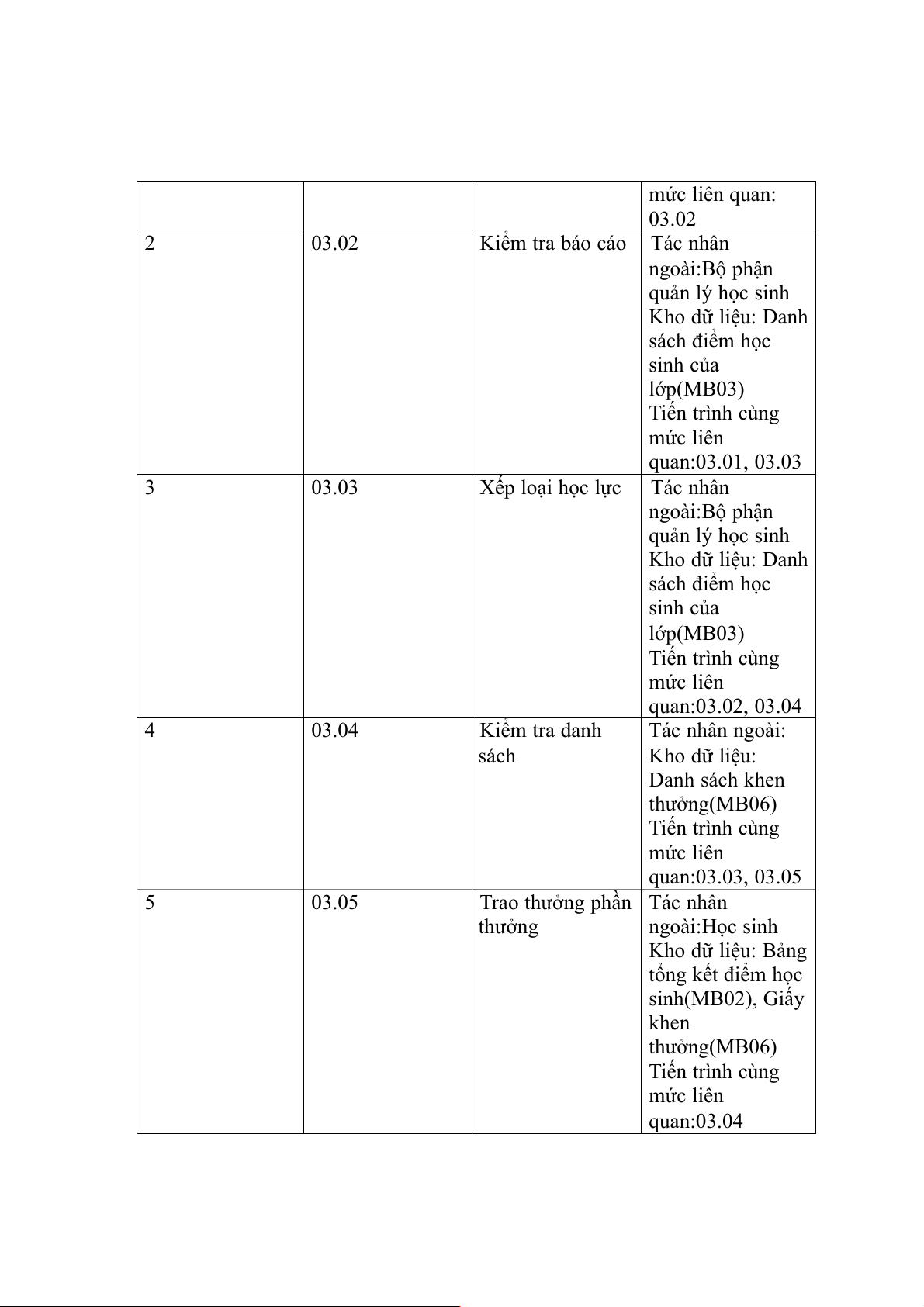 Quản lý cập nhập Tác nhân ngoài: điểm M1.2 Giáo viên M1.3 Ban giám hiệu Kho dữ liệu: - Mẫu biểu: - Bảng tổng kết điểm học sinh(MB02) - Danh sách điểm học sinh của lớp(MB03) Tiến trình cùng mức:01,03 3 03 Quản lý khen Tác nhân ngoài: thưởng M1.1 Học sinh M1.3 Ban giám hiệu Kho dữ liệu: - Mẫu biểu: - Giấy khen thưởng(MB04) - Danh sách điểm học sinh của lớp(MB03) - Bảng tổng kết điểm học sinh(MB02) - Tiến trình cùng mức 02