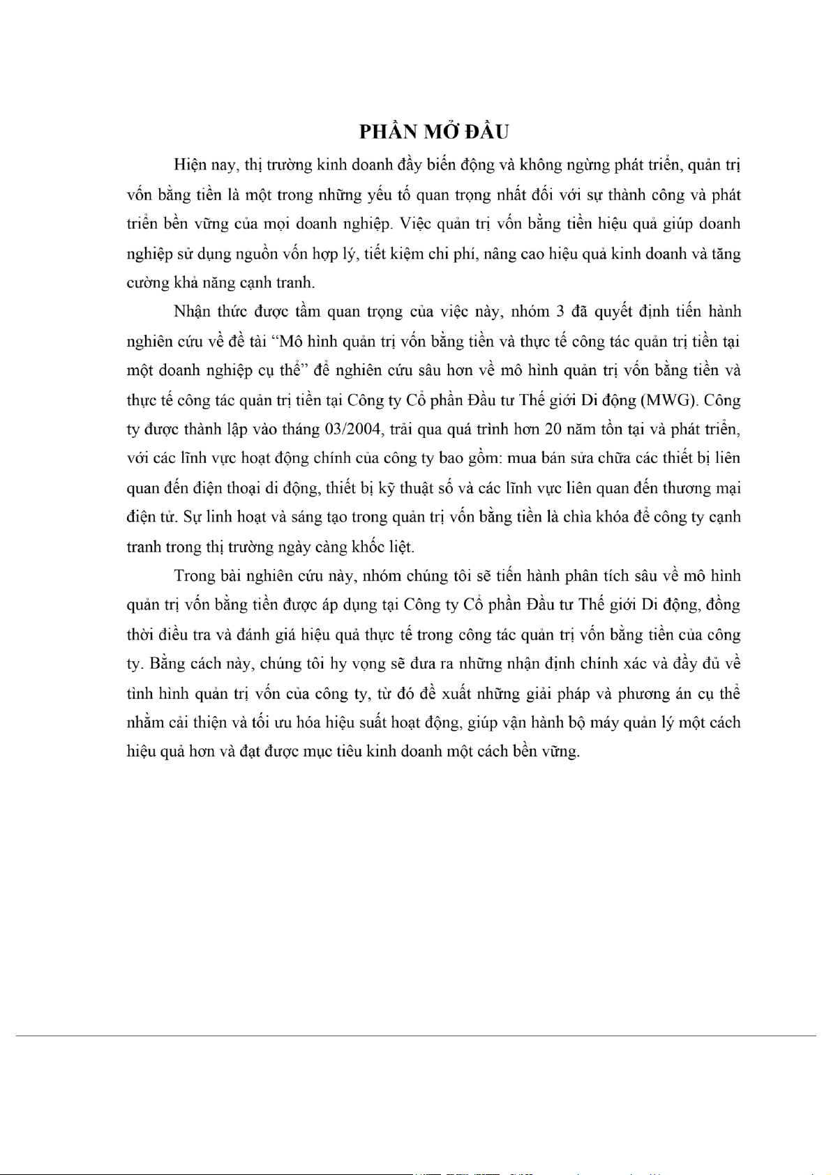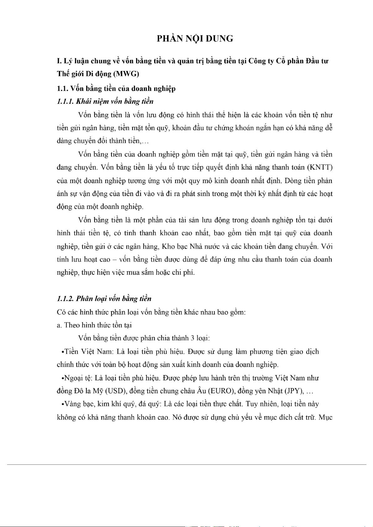 II. Thực trạng quản trị vốn bằng tiền của Công ty Cổ phần Đầu tư Thế giới Di động (MWG)