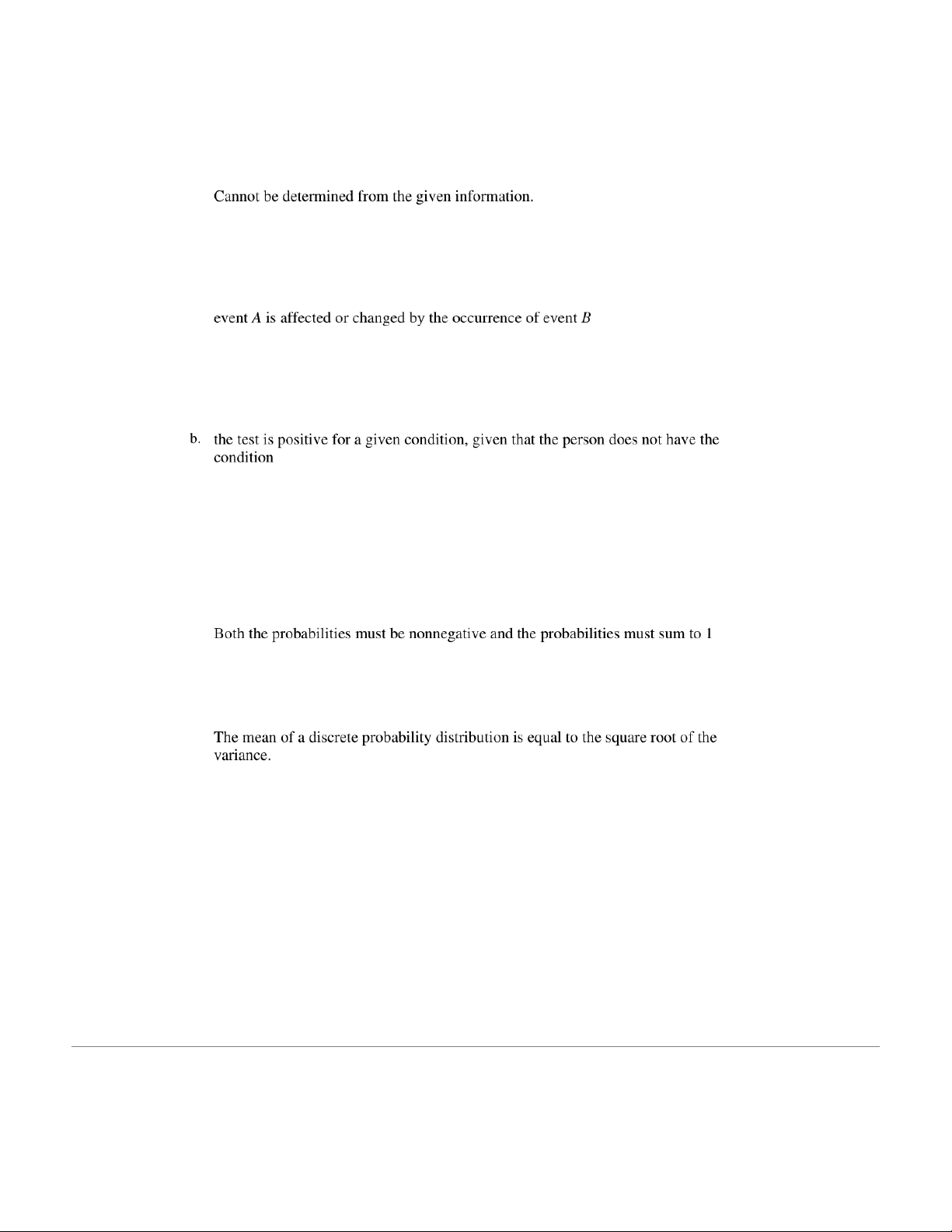____ 13. Two events A and B are said to be dependent if and only if: a. P(A) = P(B)