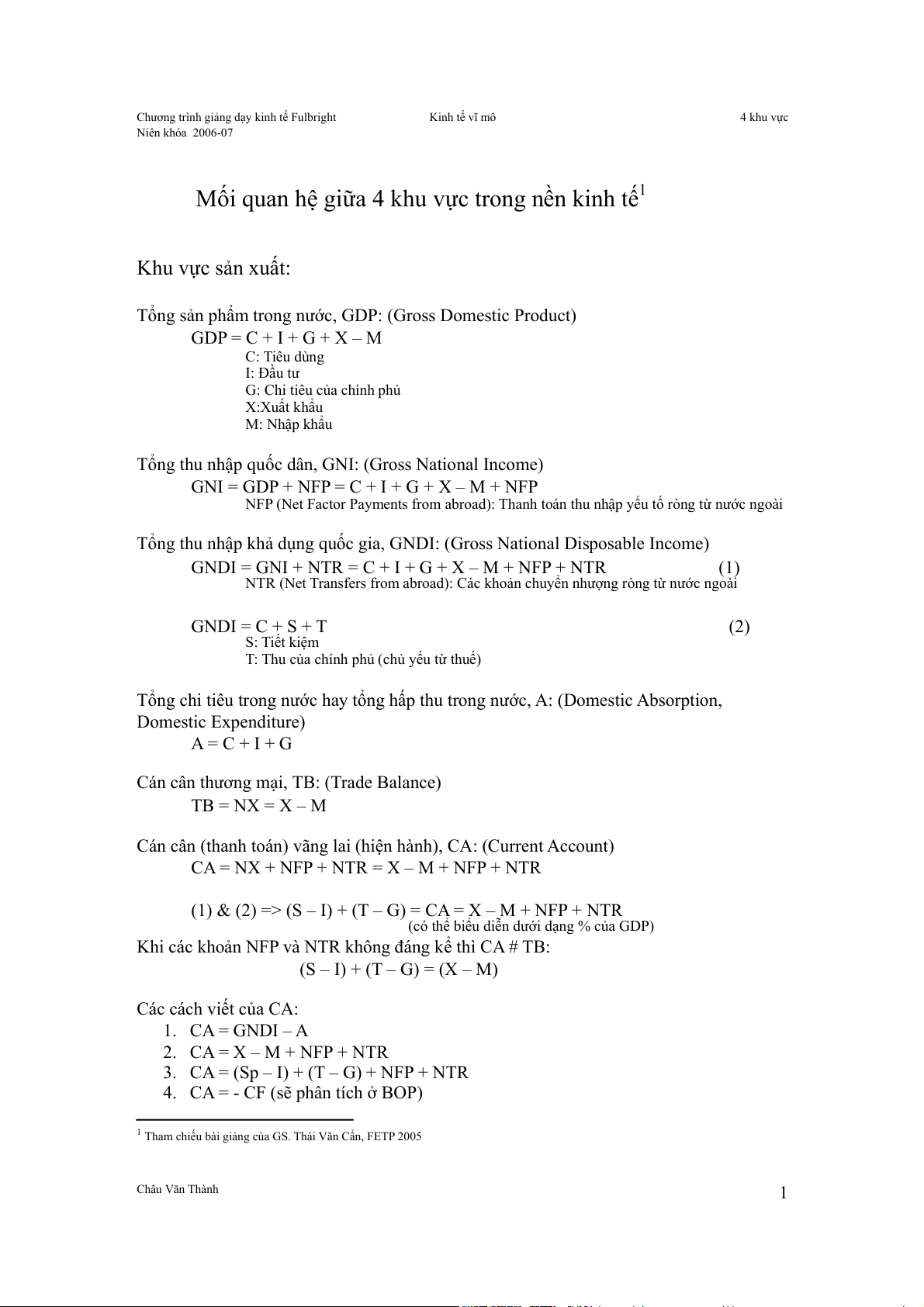 (S – I) + (T – G) = (X – M) Các cách viết của CA: 1. CA = GNDI – A 2. CA = X – M + NFP + NTR