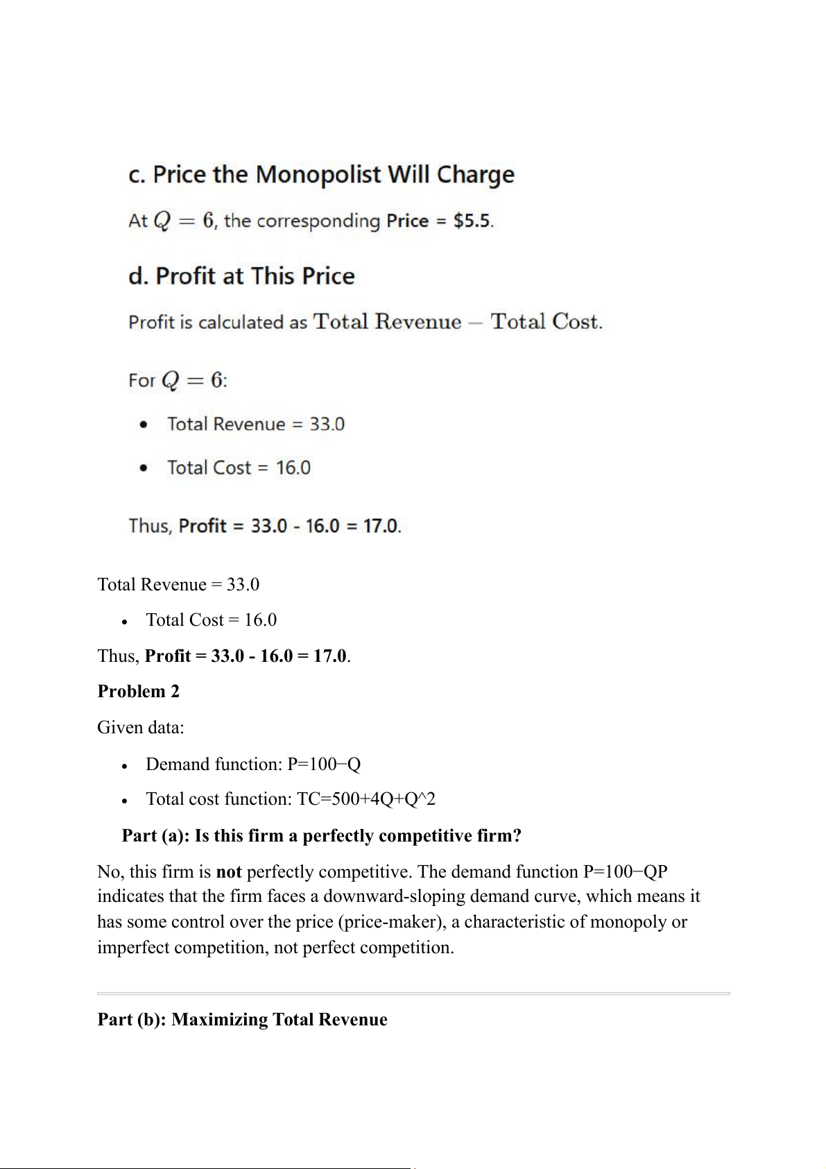 Thus, Profit = 33.0 - 16.0 = 17.0. Problem 2 Given data: Demand function: P=100−Q