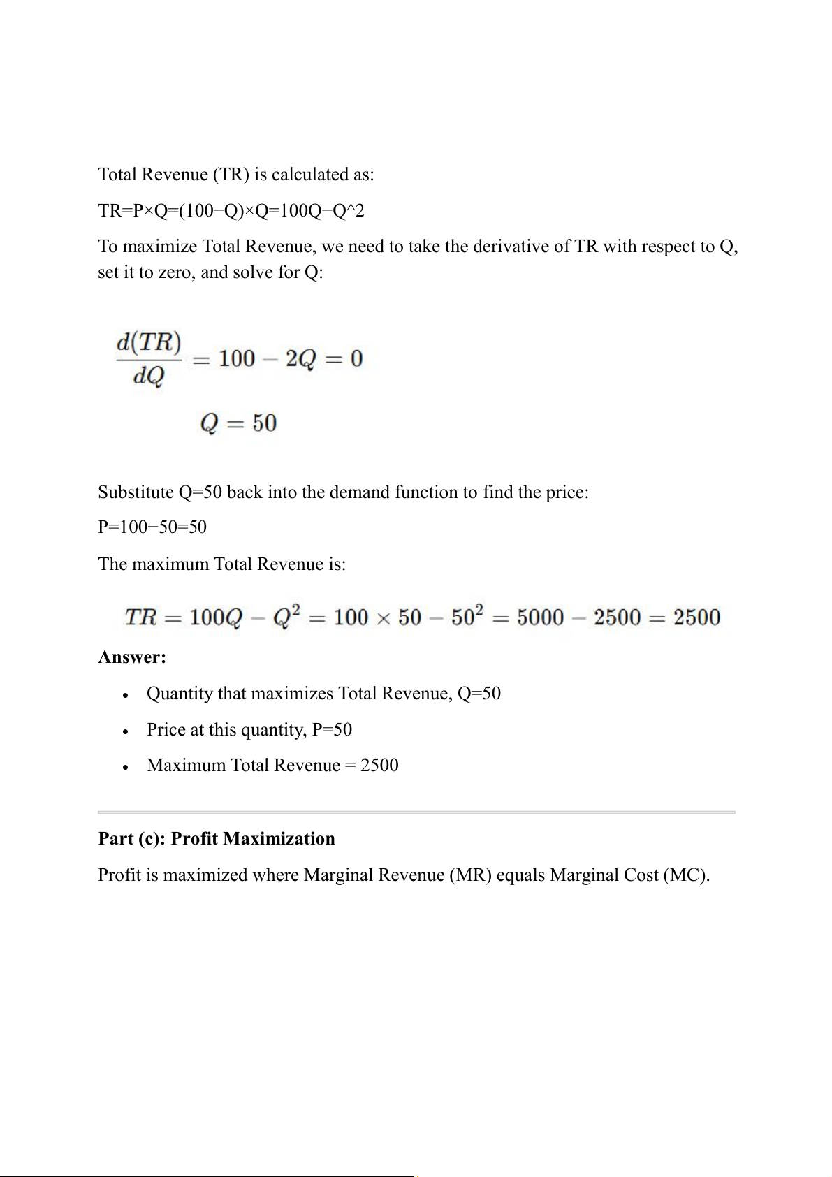Quantity that maximizes Total Revenue, Q=50 Price at this quantity, P=50 Maximum Total Revenue = 2500 Part (c): Profit Maximization